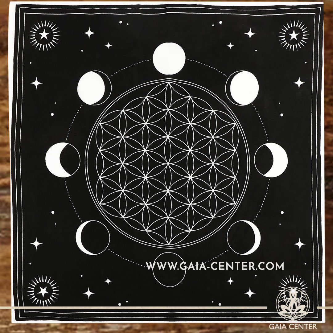 Altar Cloth – Moon Phase Crystal Grid & Flower of Life style 70x70cm is perfect for Tarot, Oracle cards, Intuitive Reading, Crystal and Rune placement.