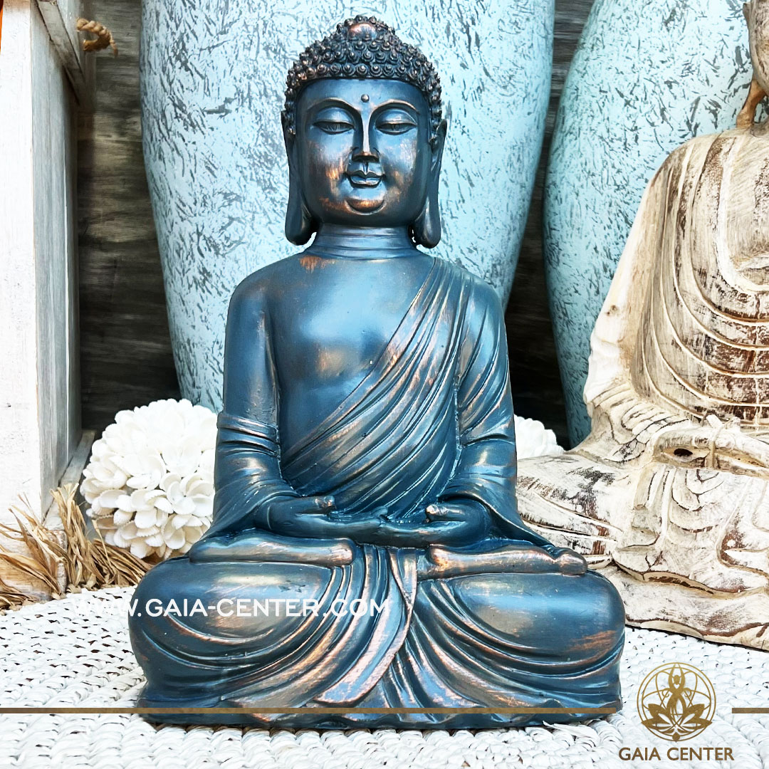 Buddha Statue meditating pose antique blue and copper color finishing at Gaia Center Crystal incense Buddhist shop in Cyprus.