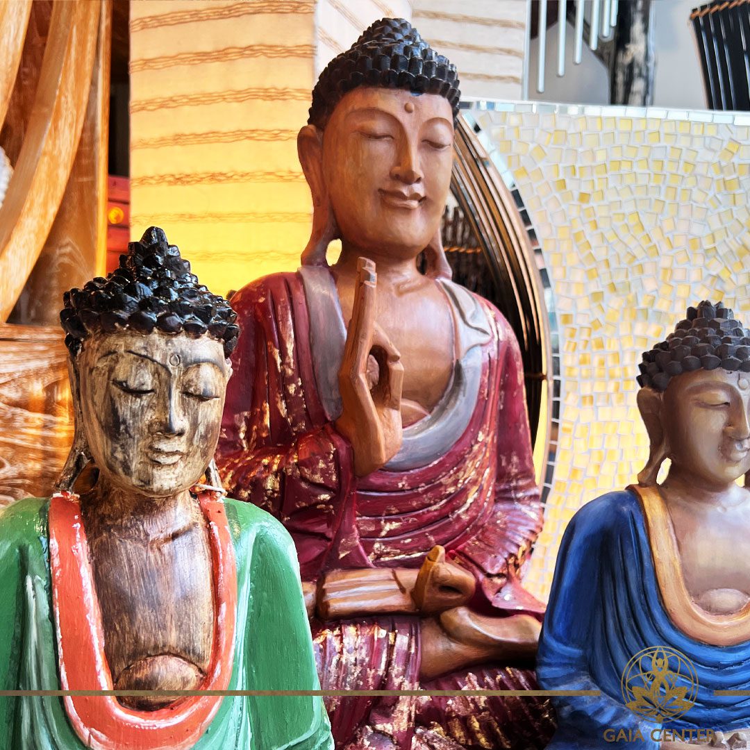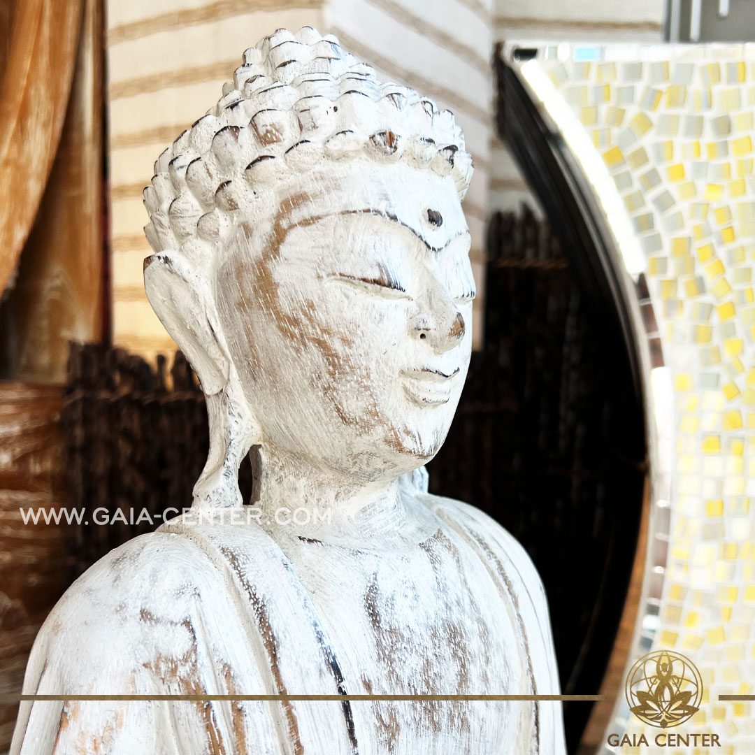 Buddha Statue made from teak wood and hand carved by Balinese artisans. Natural wooden design with white wash elements.