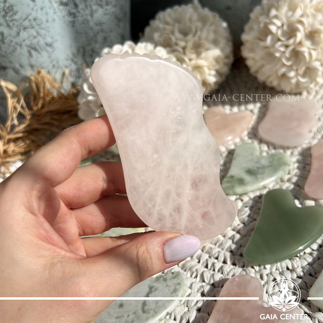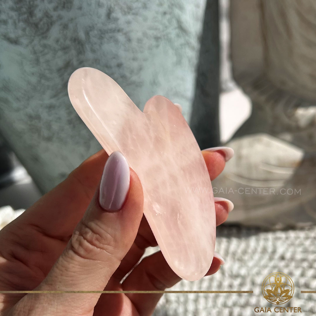 Gua Sha Massage Stone Rose Quartz crystals at Gaia Center Crystal shop in Cyprus.
