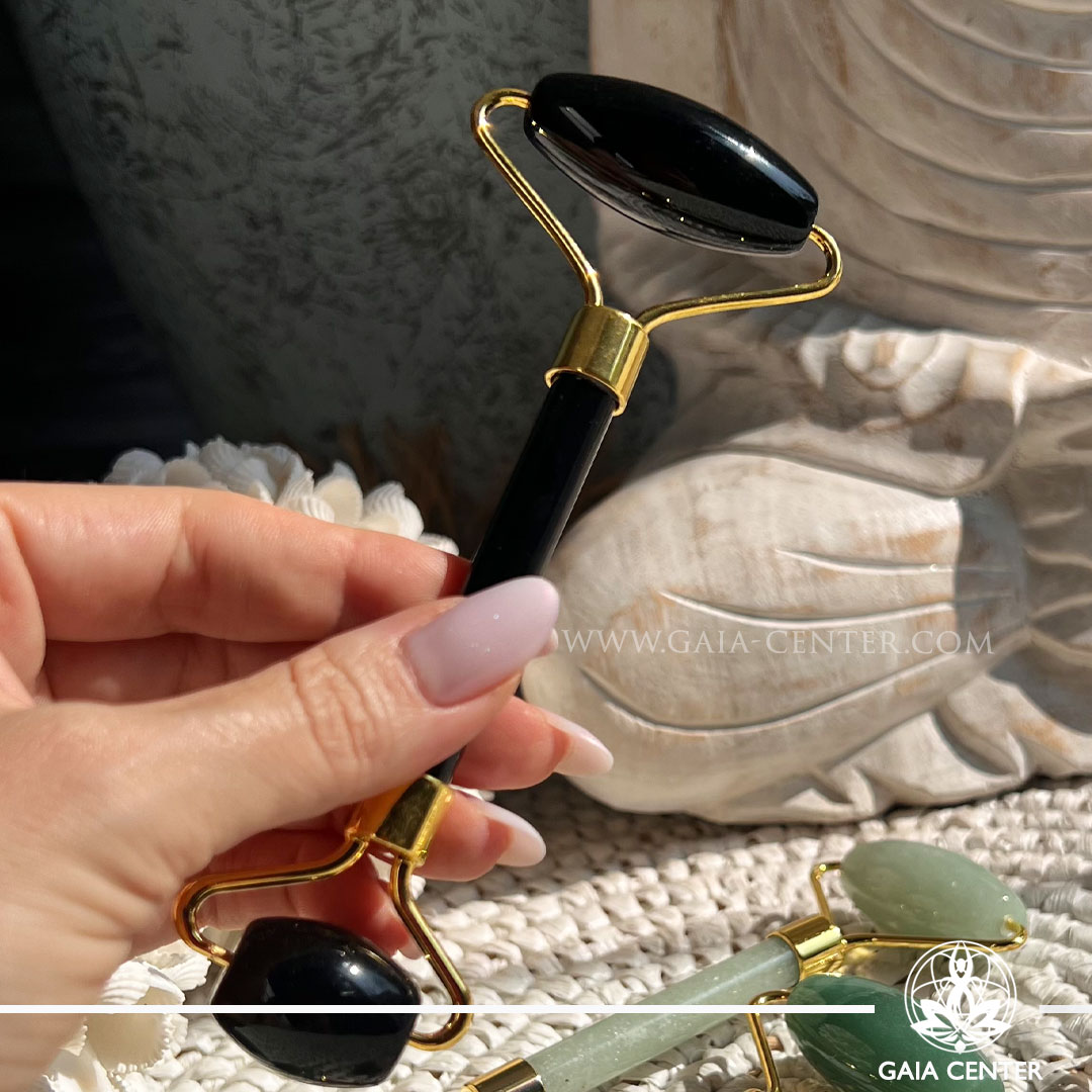Crystal Face Roller made from Black Obsidian crystal at GAIA CENTER Crystal Shop in Cyprus. Revitalize your skincare routine with our Gemstone Face Roller, crafted from natural gemstones like jade, rose quartz, black obsidian or amethyst. This luxurious facial massage tool helps reduce puffiness, improve circulation, and promote lymphatic drainage. Perfect for all skin types, it enhances the absorption of skincare products and brings a calming, cooling sensation. Ideal for daily use, our gemstone roller is the perfect addition to your beauty regimen for a radiant, youthful complexion.