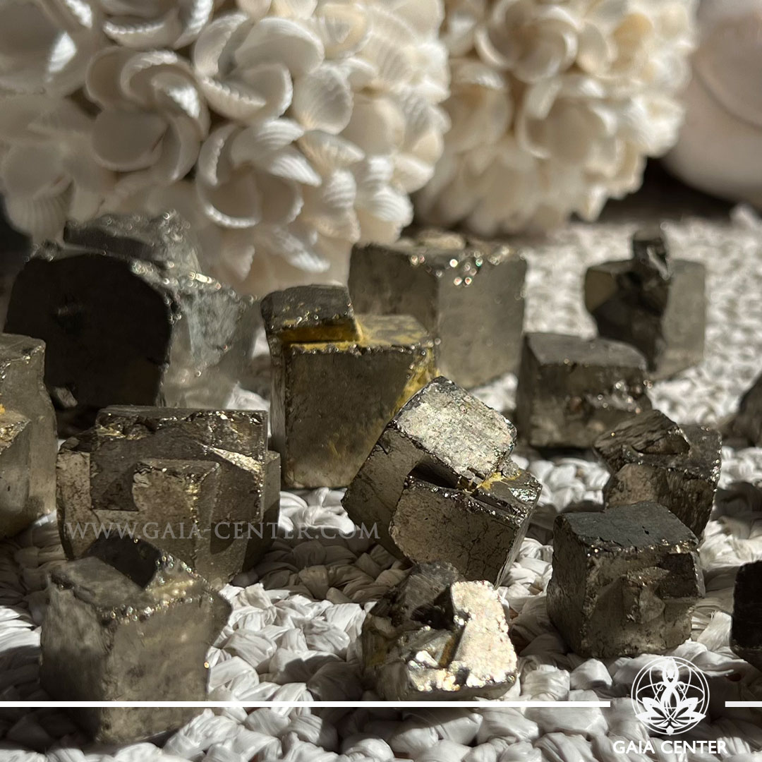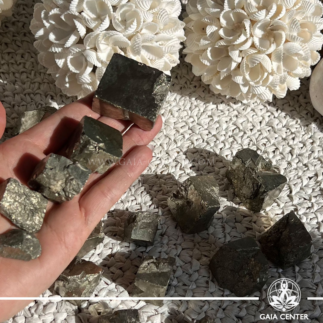 Natural Rough Pyrite Cubes at Gaia Center – Cyprus’ top crystal shop! Perfect for abundance, protection, and confidence. In-store shopping & islandwide delivery.