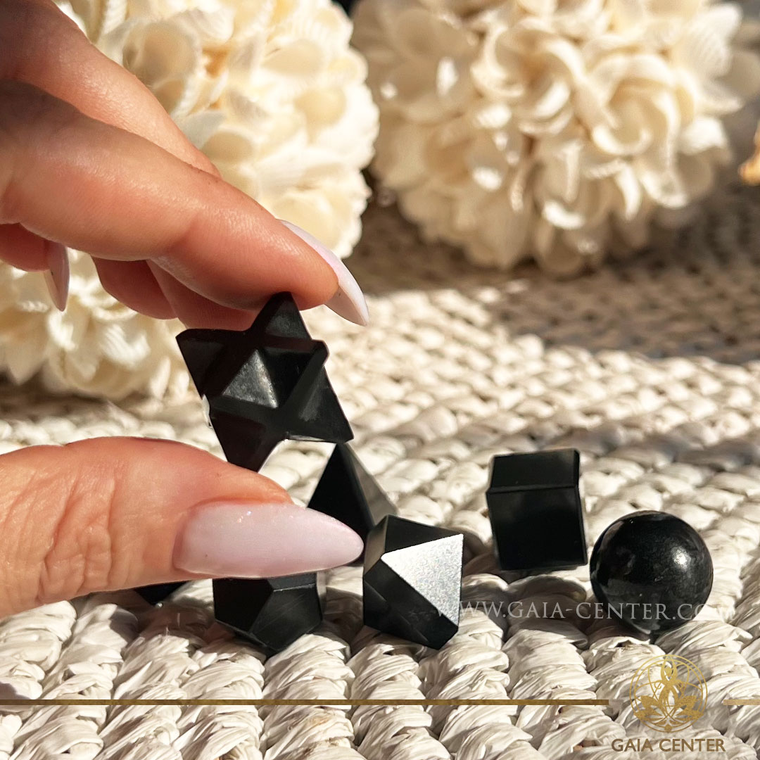 Sacred Geometry Crystal Set – Black Agate at Gaia Center Crystal shop in Cyprus.