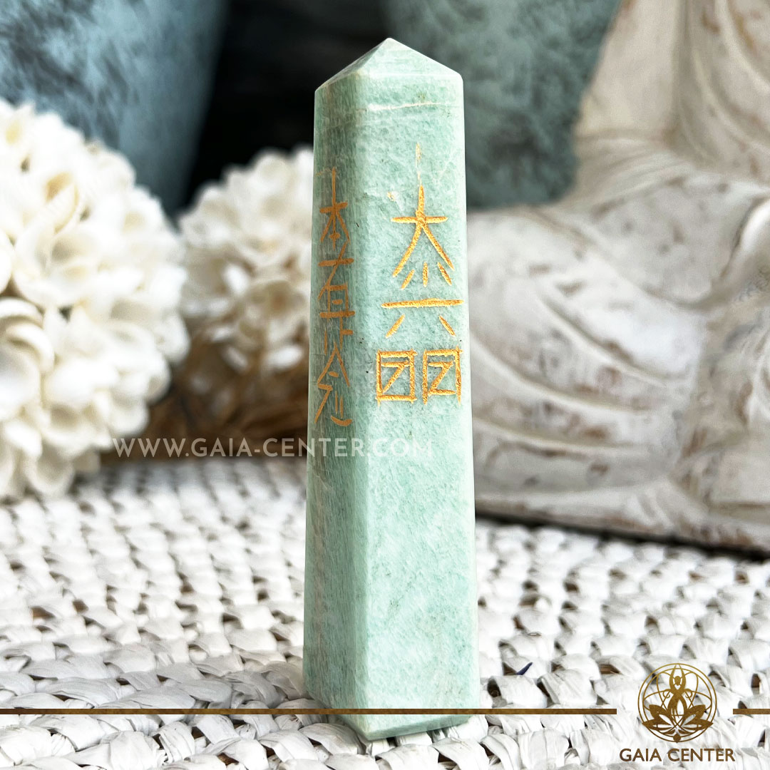 Amazonite Crystal Reiki Symbols Obelisk polished point tower.