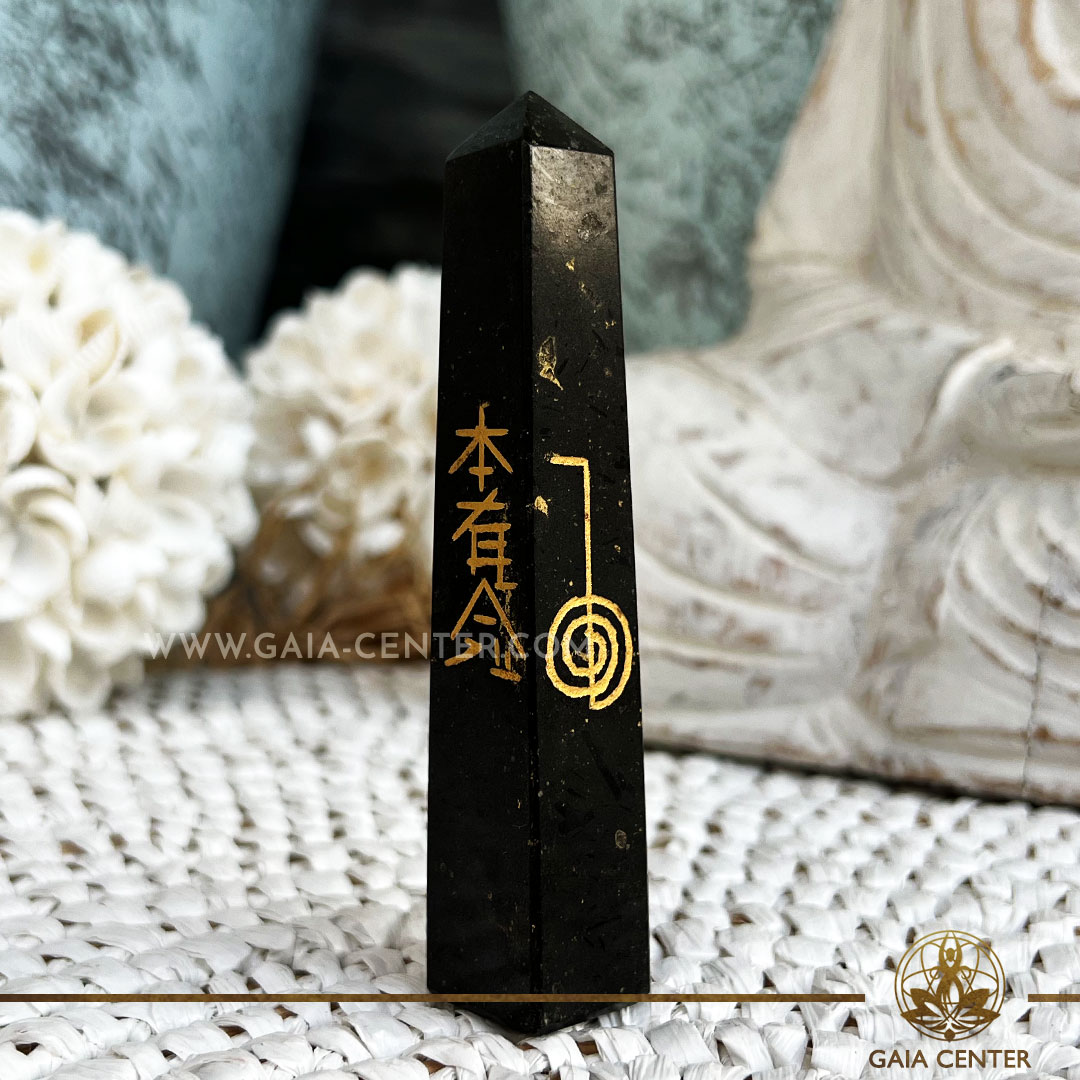 Black Tourmaline Crystal Reiki Symbols Obelisk polished point tower.