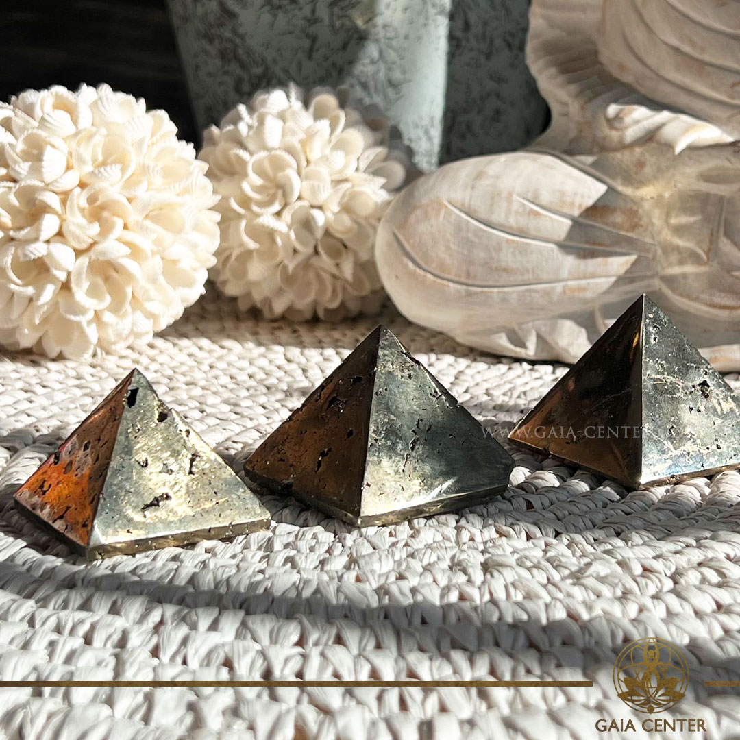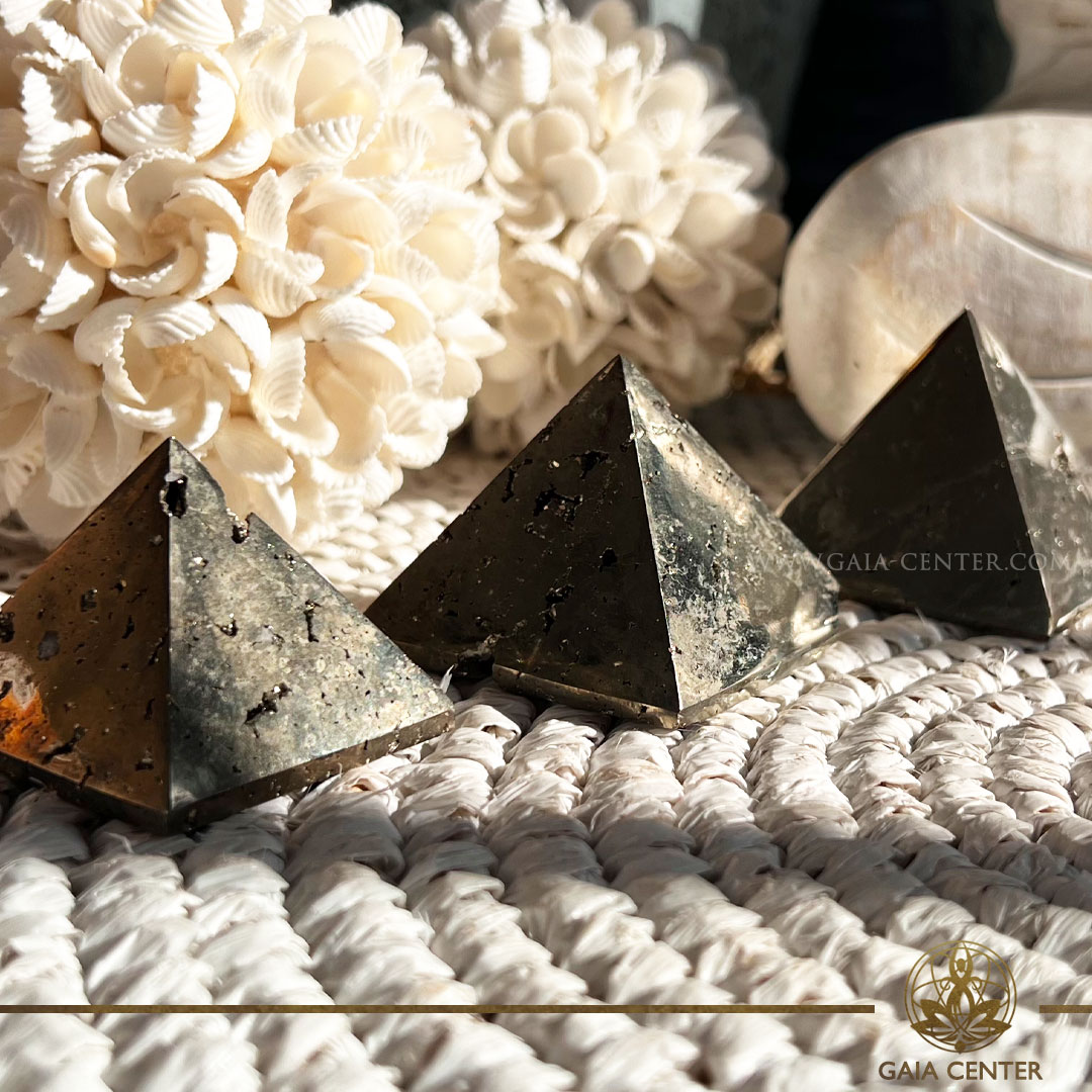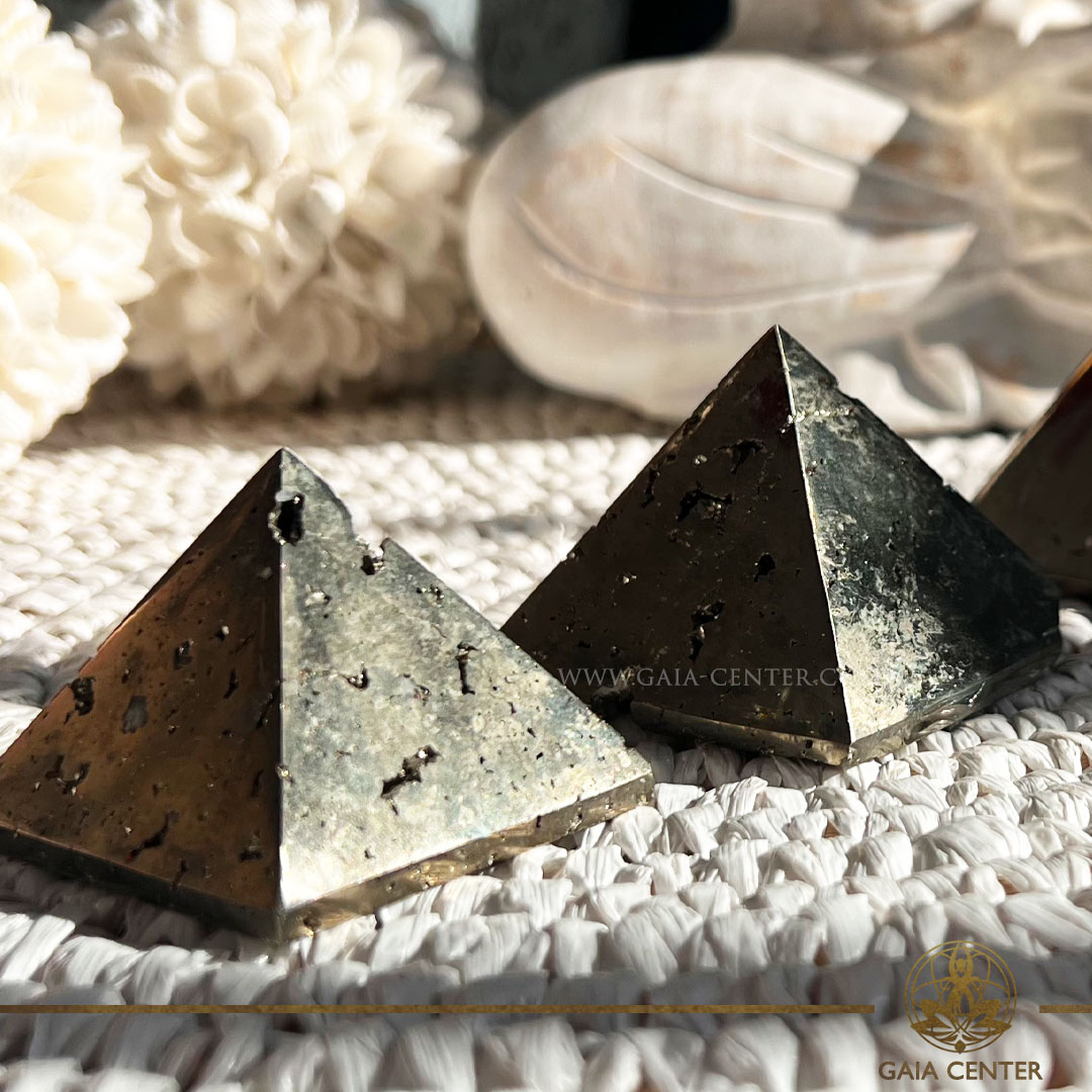 Pyrite Crystal Pyramid – Polished from Peru at Gaia Center Crystal shop in Cyprus.