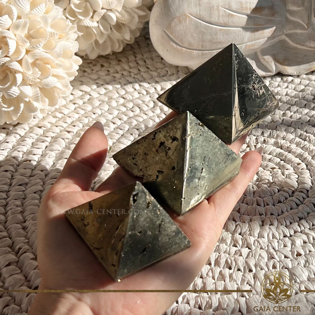 Pyrite Crystal Pyramid – Polished from Peru at Gaia Center Crystal shop in Cyprus.