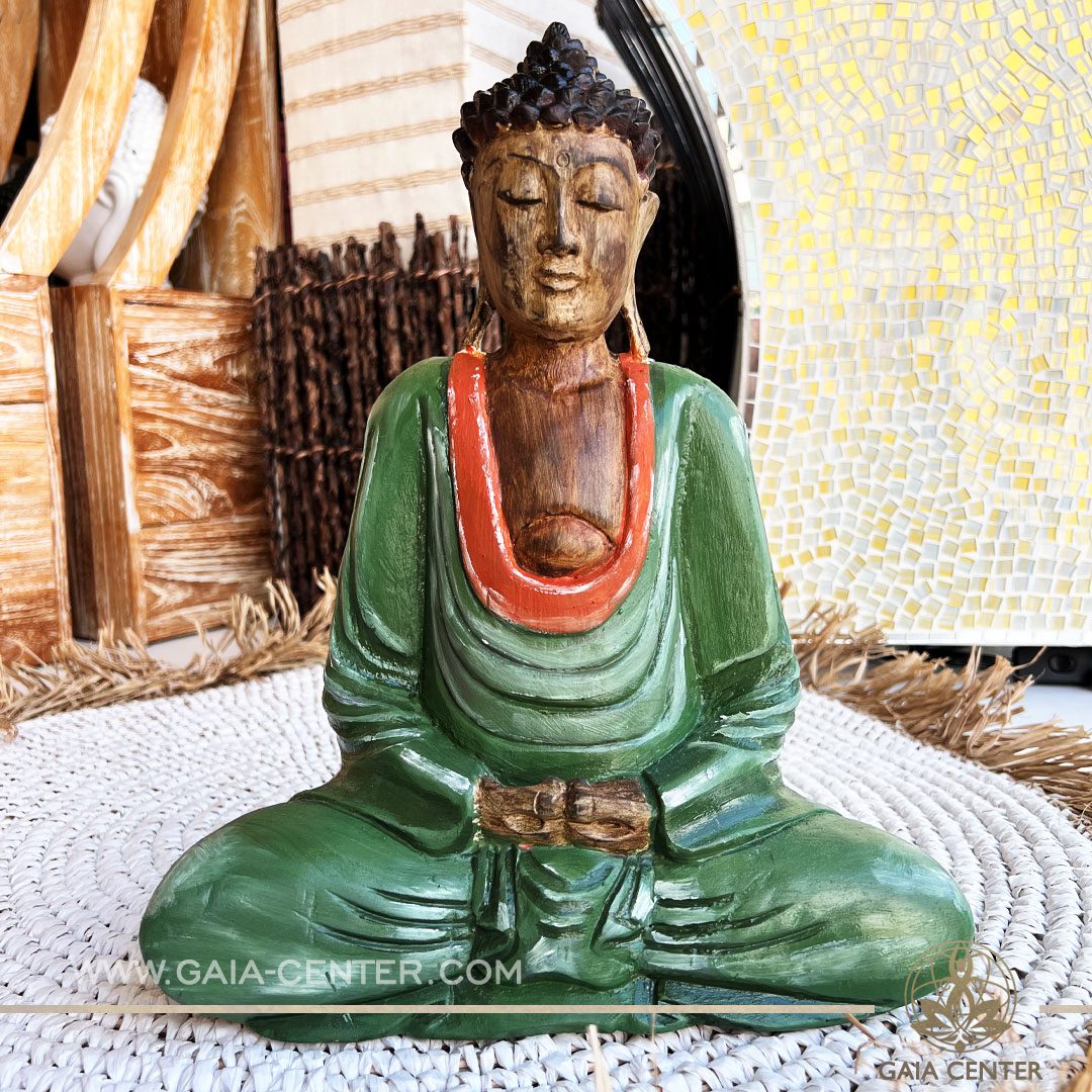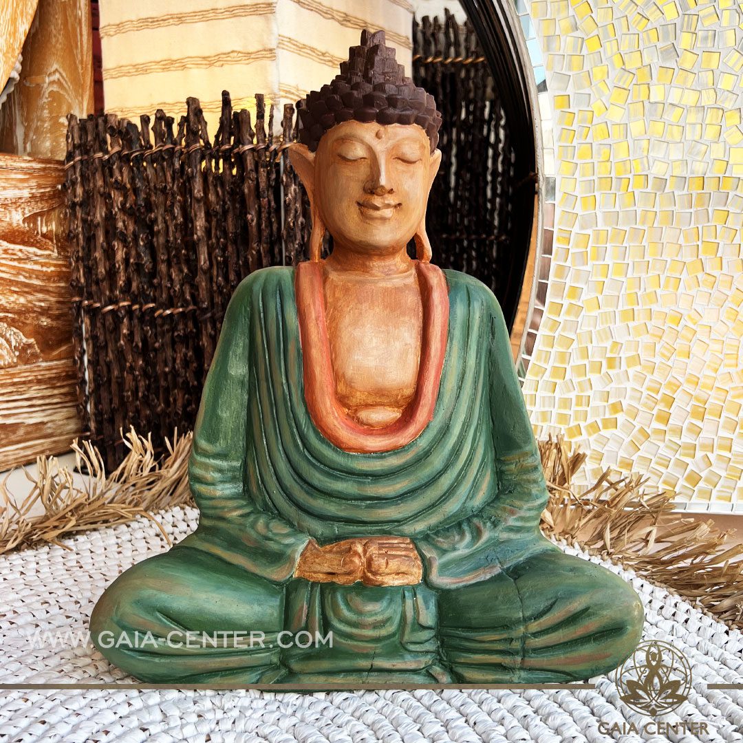 Buddha-Statue-teakwood-green-gold-handmade-meditating-spiritual-decor-Gaia-Center-Cyprus