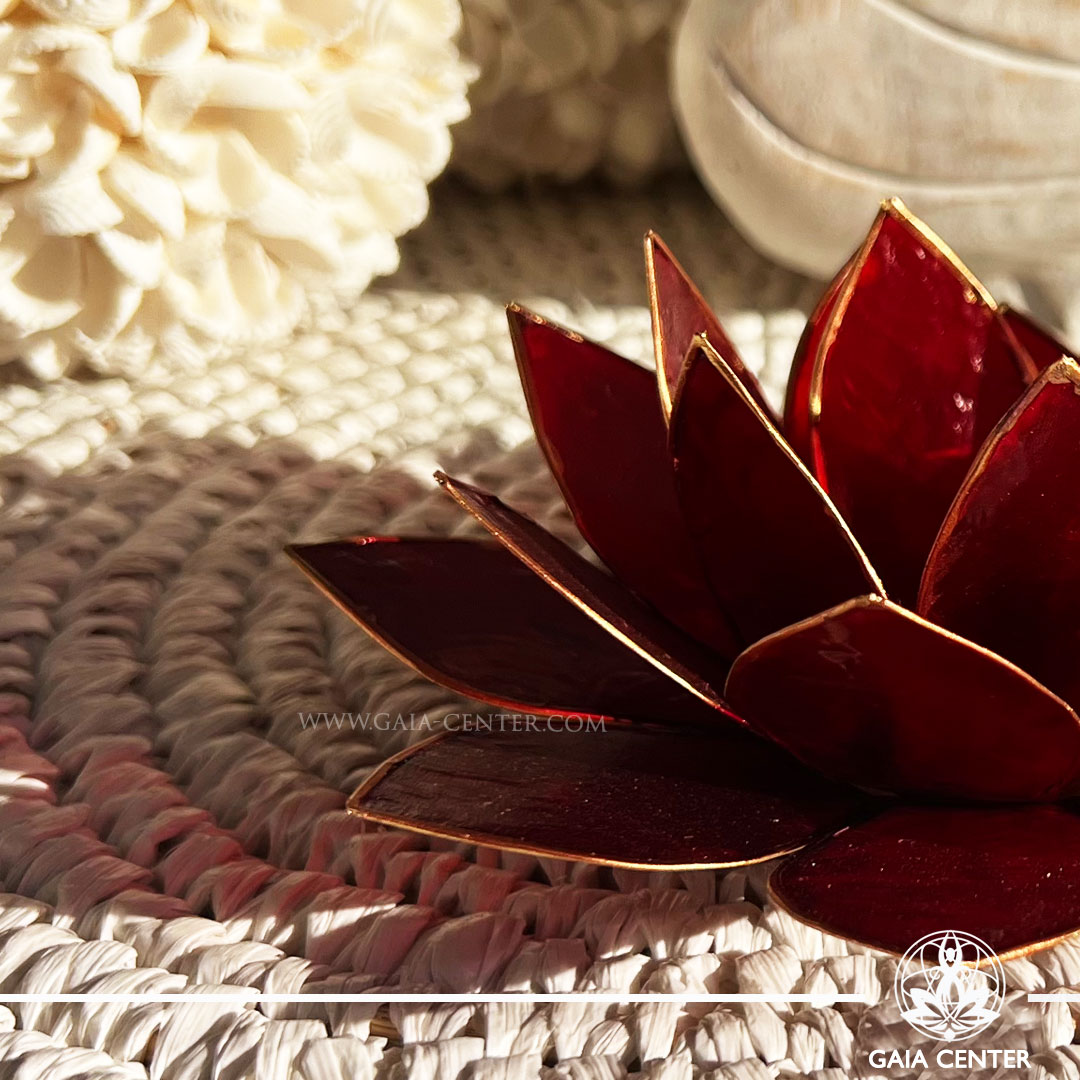 Lotus Flower Candle Holder – Red Gold Trim |Capiz Shell| at GAIA CENTER crystal store in Cyprus.