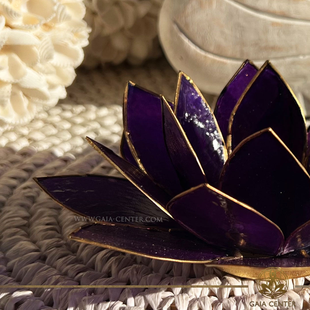 Lotus Flower Candle Holder – Purple Gold Trim |Capiz Shell| at GAIA CENTER crystal store in Cyprus.