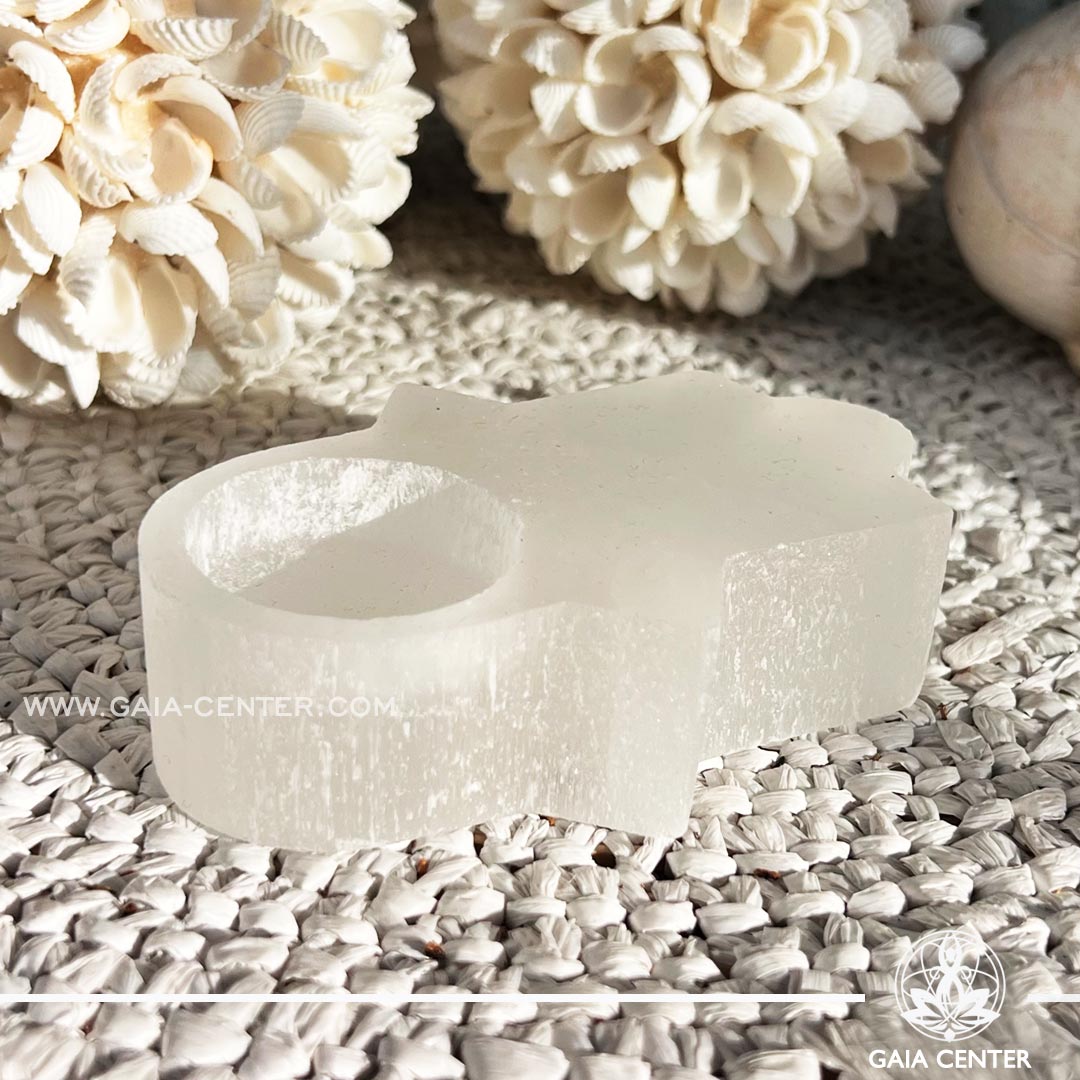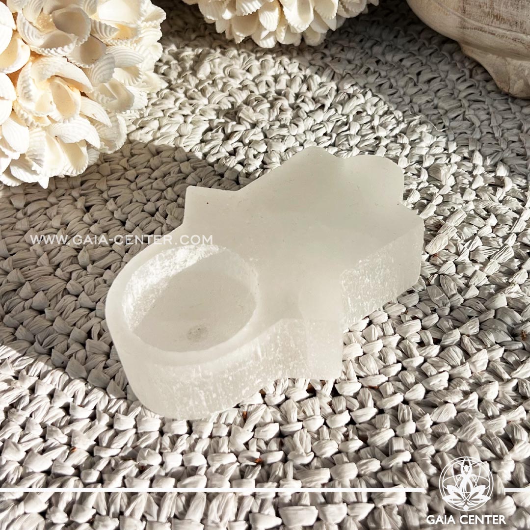Selenite Hamsa Crystal Candle Holder from Morocco at Gaia Center Crystal shop in Cyprus.