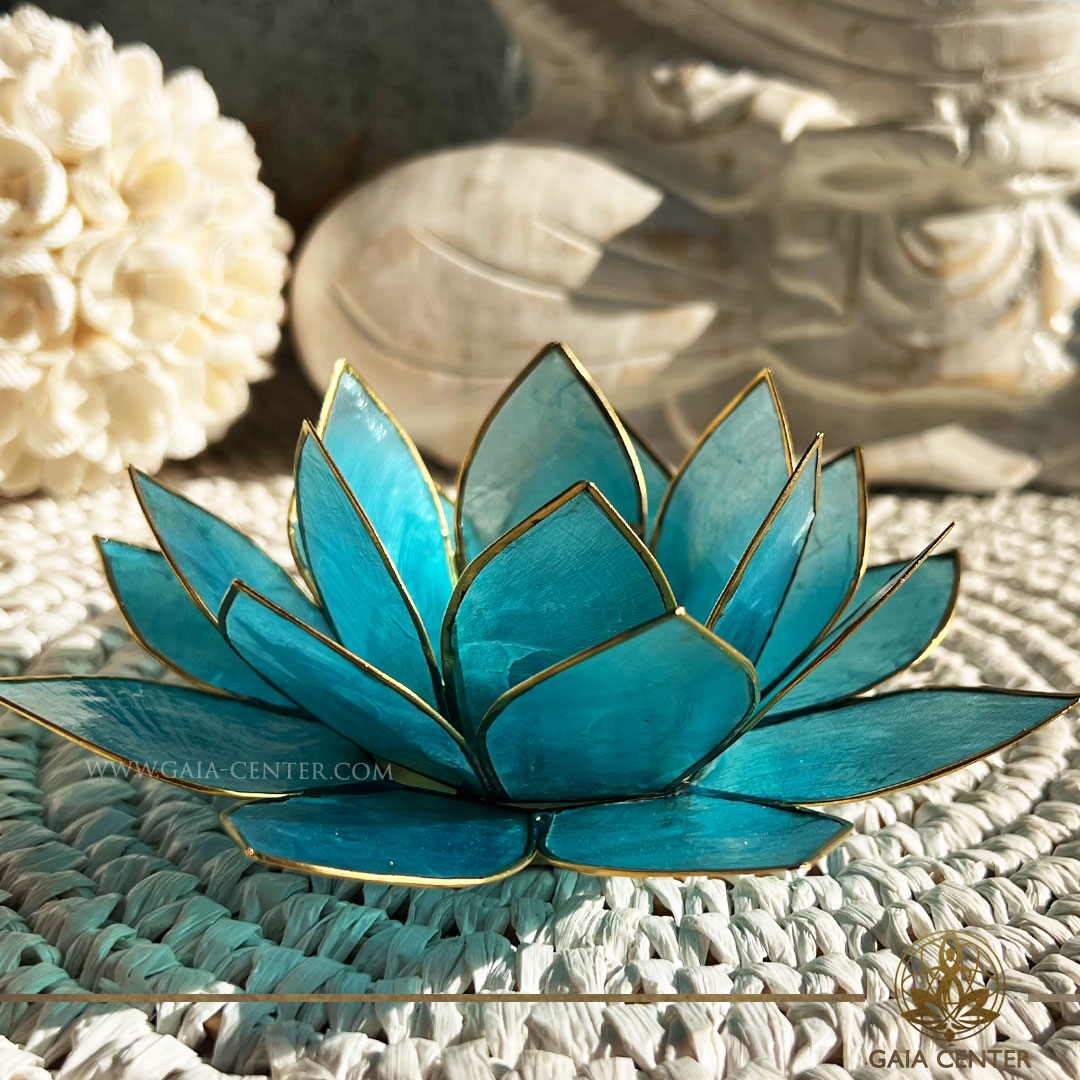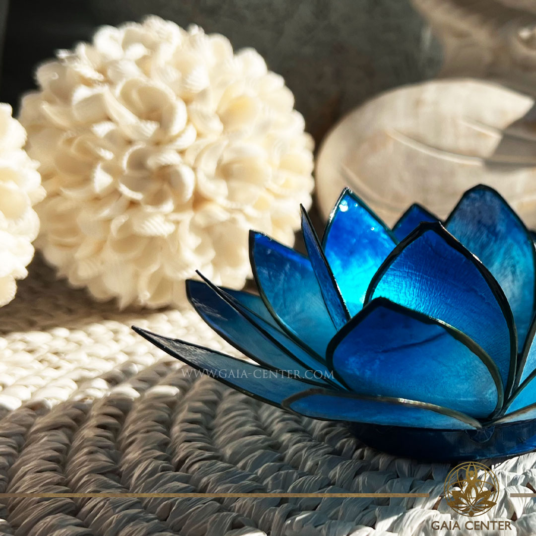 Lotus Flower Candle Holder – Blue Gold Trim |Capiz Shell| at GAIA CENTER crystal store in Cyprus.