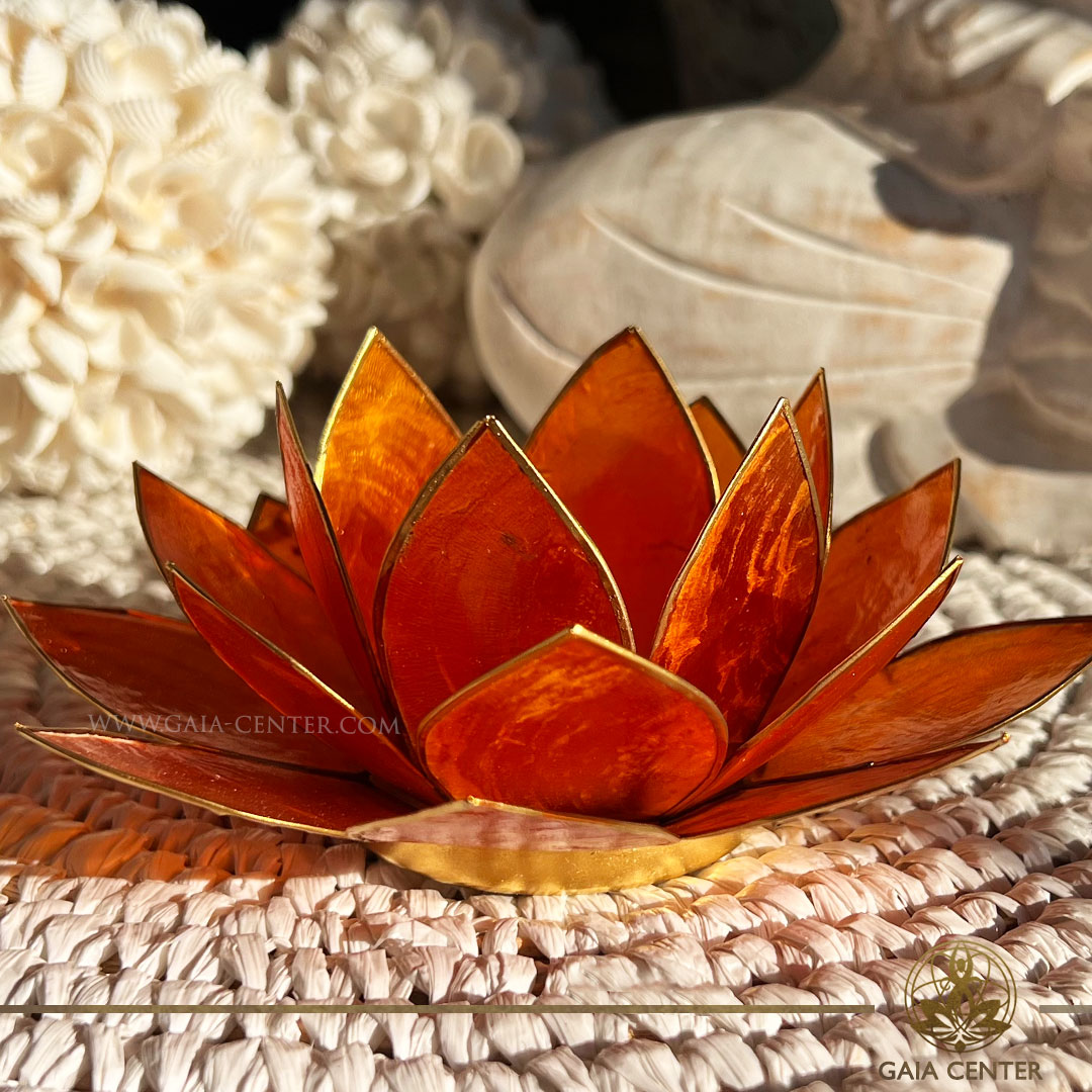 Lotus Flower Candle Holder – Orange Gold Trim |Capiz Shell| at GAIA CENTER crystal store in Cyprus.