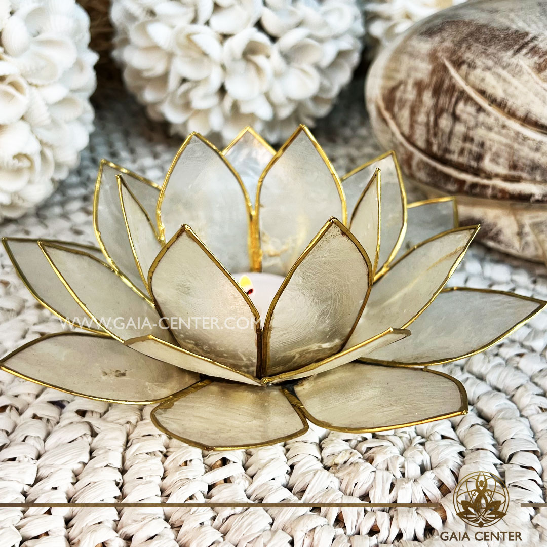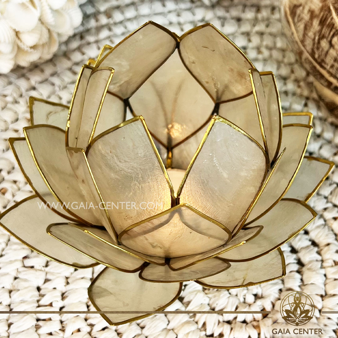 Natural Seashell Capiz Candle holder Tea-Light Lotus Flower Design. Natural White Color with gold color trim. Selection of home decor items at Gaia Center Crystal Incense Shop in Cyprus.
