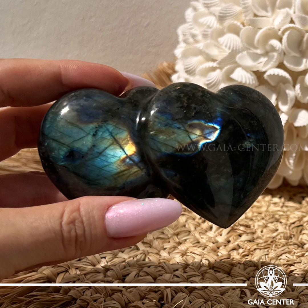 Labradorite Crystal Double Puff Heart from Madagascar at GAIA CENTER Crystal Shop CYPRUS. Crystal jewellery and crystal pendants at Gaia Center crystal shop in Cyprus. Order online top quality crystals, Cyprus islandwide delivery: Limassol, Larnaca, Paphos, Nicosia. Europe and Worldwide shipping.