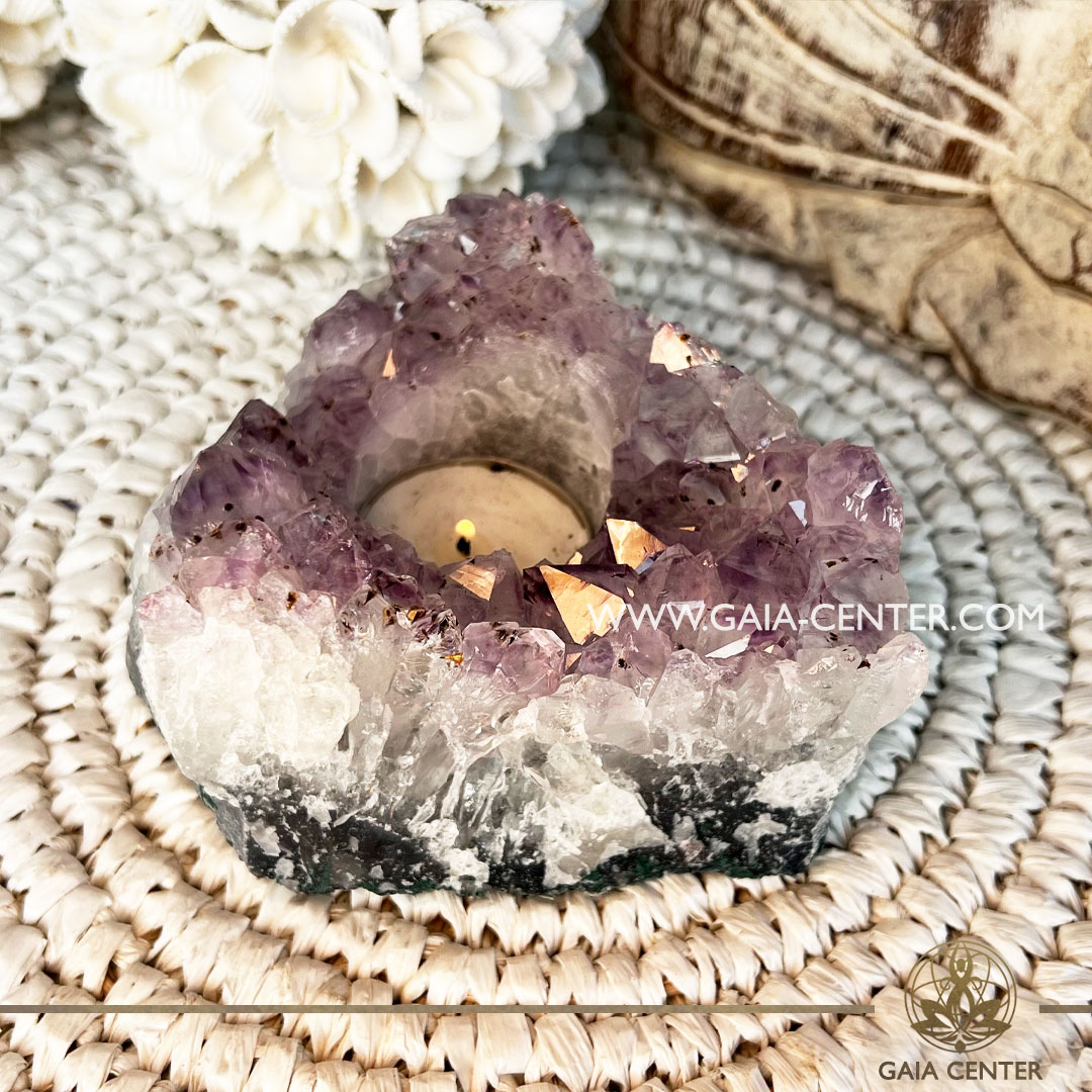 Amethyst Crystal Candle Holder or Tealight Holder. Crystal and Gemstone selection at Gaia Center Crystal Shop in Cyprus. Shop online at https://gaia-center.com. Cyprus island delivery: Limassol, Nicosia, Paphos, Larnaca. Europe and Worldwide shipping.