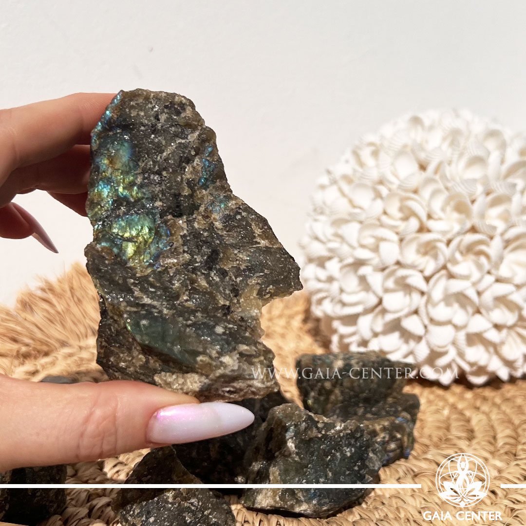 Labradorite Rough natural unpolished crystal quartz clusters from Madagascar at GAIA CENTER Crystal shop in Cyprus.