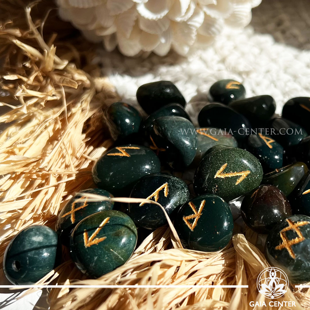 Shop authentic Bloodstone Rune Stones at Gaia Center Crystal Shop in Cyprus. Perfect for protection, energy healing, and divination. In-store & islandwide delivery available