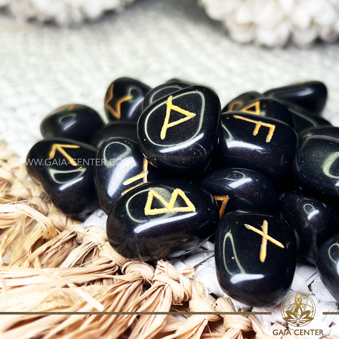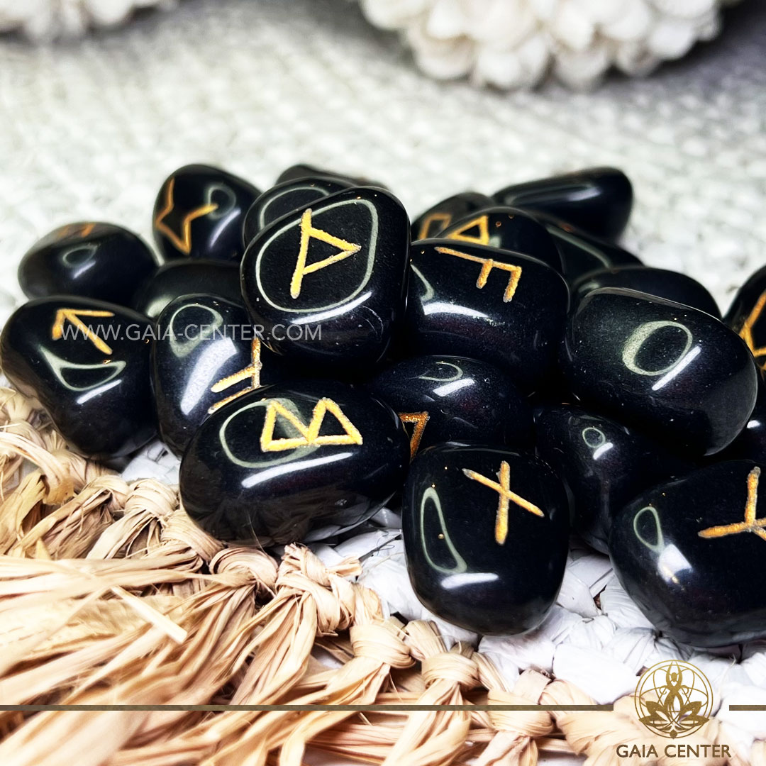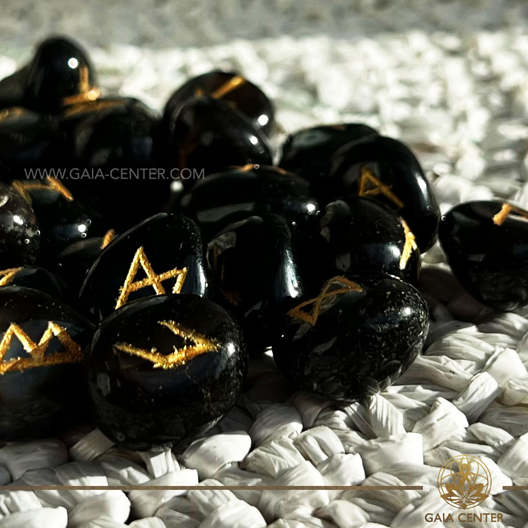 Crystal Rune Stones Black Onyx at Gaia Center Crystal shop in Cyprus. Crystal and Gemstone Jewellery Selection at Gaia Center in Cyprus. Order online, Cyprus islandwide delivery: Limassol, Larnaca, Paphos, Nicosia. Europe and Worldwide shipping.