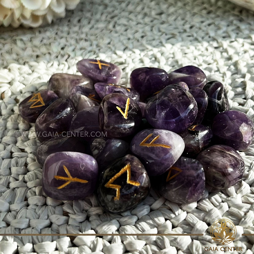 Crystal Rune Stones Amethyst at Gaia Center Crystal shop in Cyprus. Crystal and Gemstone Jewellery Selection at Gaia Center in Cyprus. Order online, Cyprus islandwide delivery: Limassol, Larnaca, Paphos, Nicosia. Europe and Worldwide shipping.