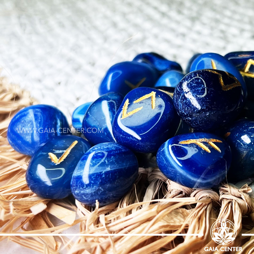Blue Onyx Rune Stones at Gaia Center Crystal shop in Cyprus.
