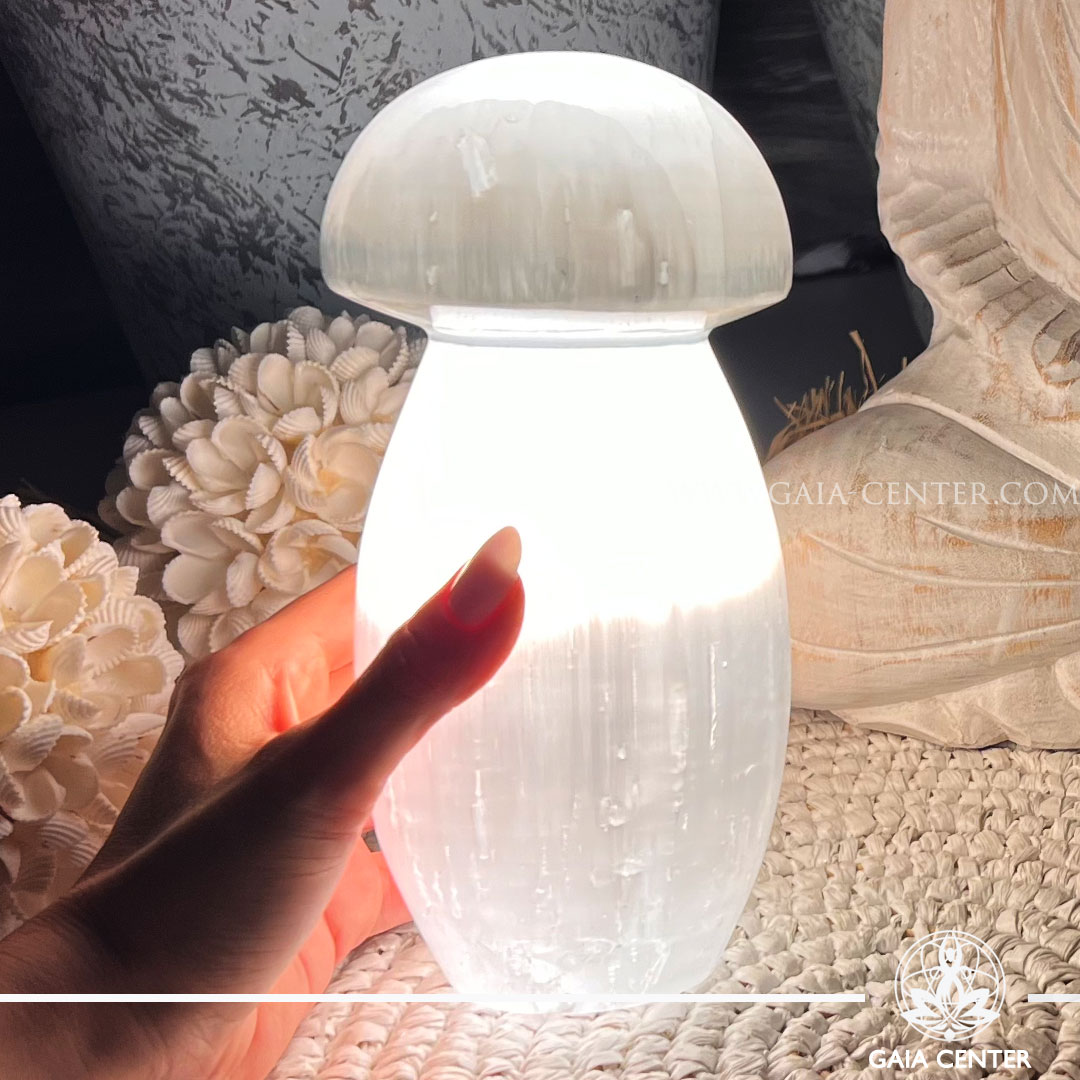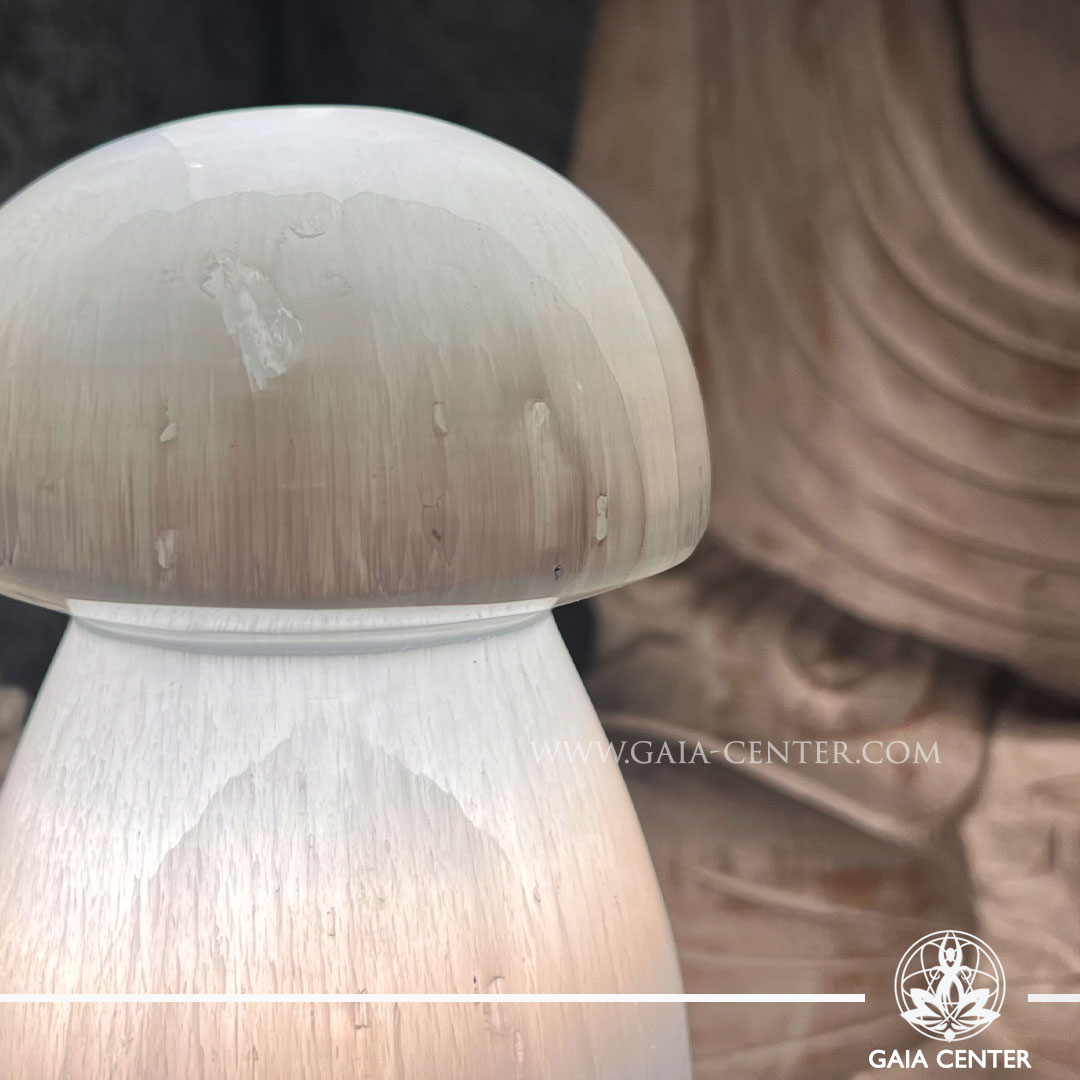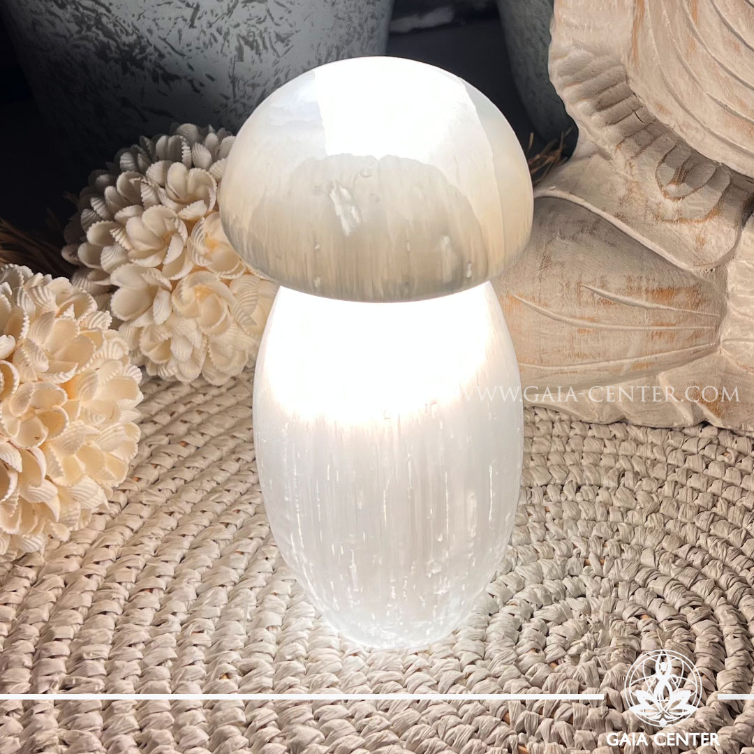 Mushroom White Selenite Crystal Lamp from Morocco at Gaia Center Crystal shop in Cyprus.