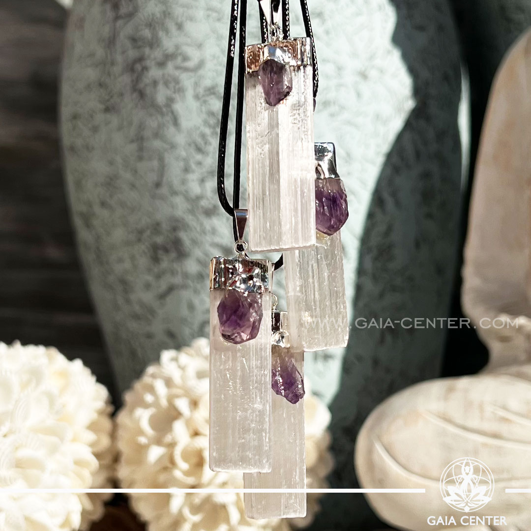 Selenite & Amethyst Crystal Pendant Silver Plated Bail from Brazil at GAIA CENTER Crystal Shop in Cyprus.