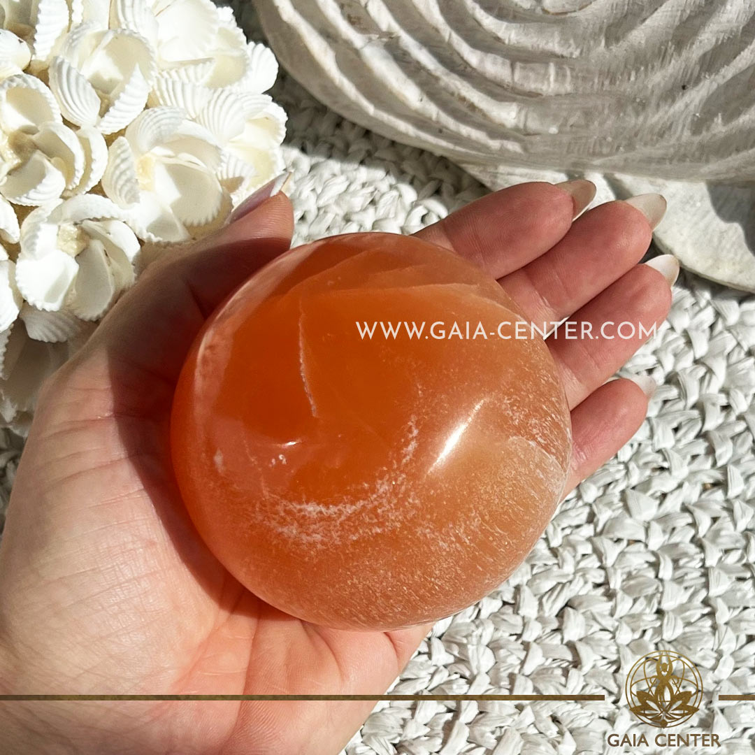 Orange Selenite Crystal Sphere |55mm| ball from Morocco at GAIA CENTER Crystal Shop CYPRUS. Crystal jewellery and crystal pendants at Gaia Center crystal shop in Cyprus. Order online top quality crystals, Cyprus islandwide delivery: Limassol, Larnaca, Paphos, Nicosia. Europe and Worldwide shipping.