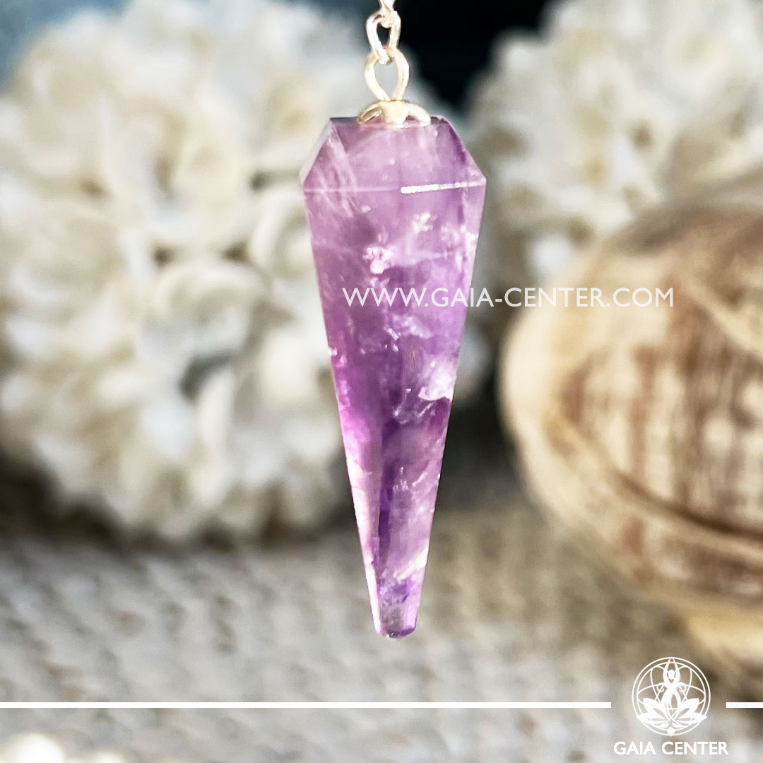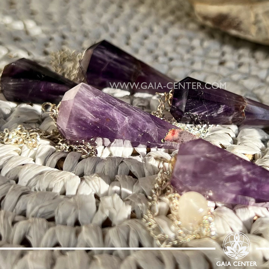 Pendulum for dowsing Amethyst Quartz faceted cone with metal chain at Gaia Center Crystal shop in Cyprus.