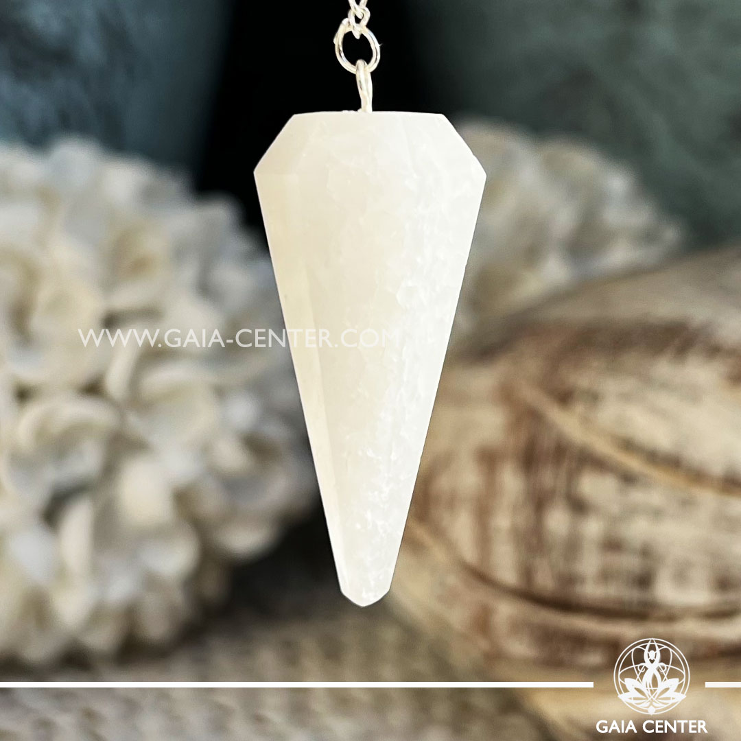 Crystal Pendulum for dowsing Snow Quartz faceted cone with metal chain at Gaia Center Crystal shop in Cyprus.