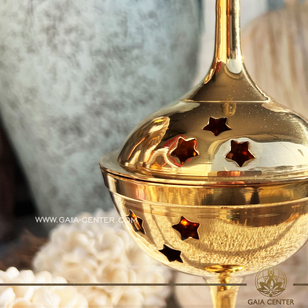Metal incense burner Pyali 28cm is ideal for burning loose incense or resins, incense cones. Star Pentagram design and a convenient chain for hanging.