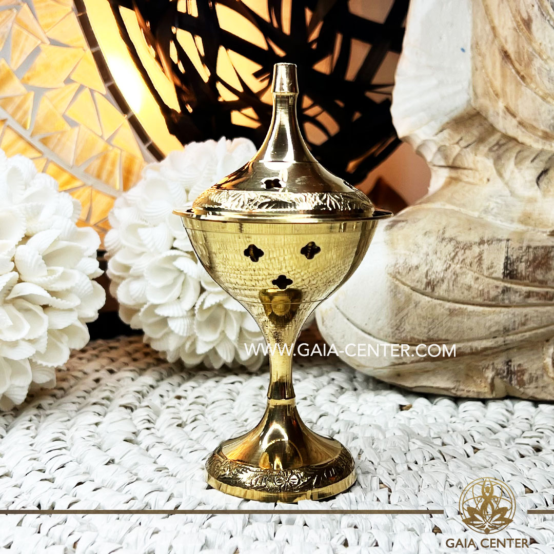 Brass incense burner is ideal for burning loose incense or resins. Selection of incense burners, aroma resins and smudge sticks for ceremonies and rituals at GAIA CENTER Crystals Incense shop in Cyprus.