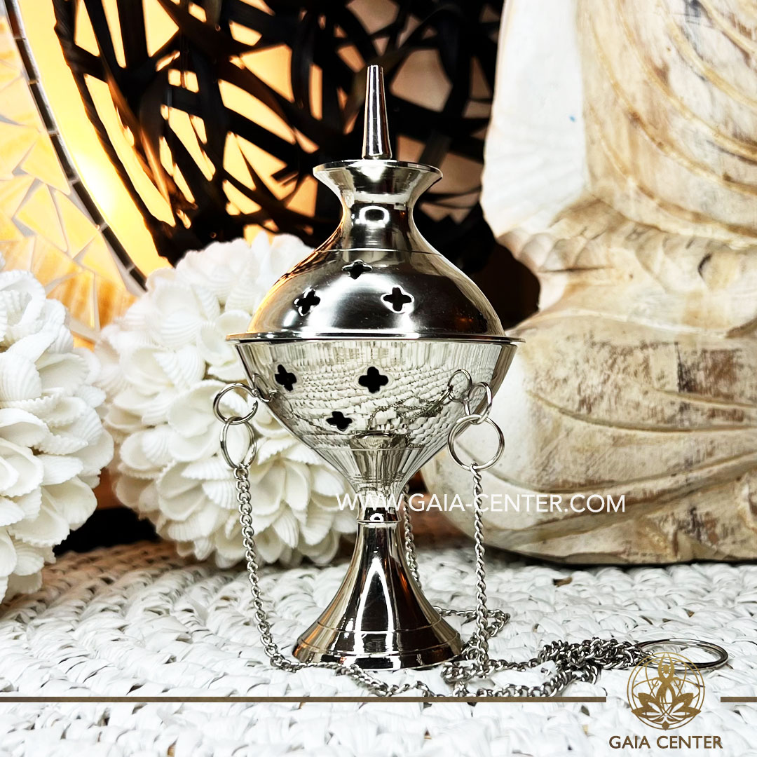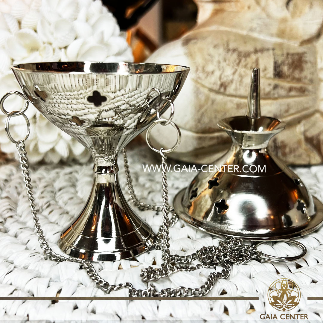 Read Morechrome-metal-hanging-incense-holder-for-charcoal-resin-incense-1pic-Gaia-Center-Crystal-Shop-Cyprus