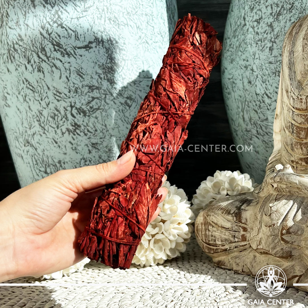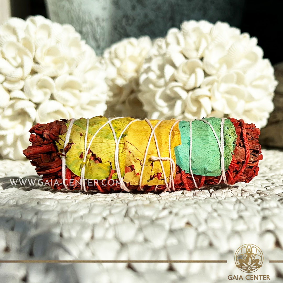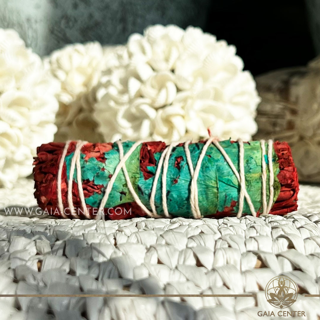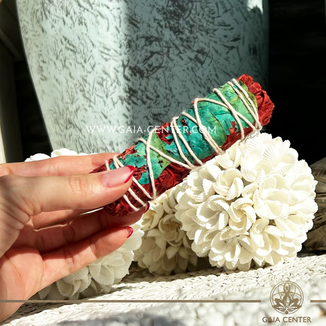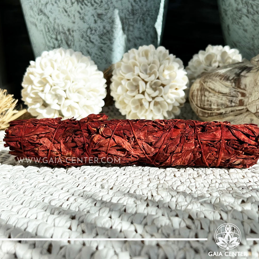 Californian White Sage and Dragon’s Blood smudge stick bundles for smudging ceremonies and space clearing at Gaia Center | Crystals and Incense shop in Cyprus.