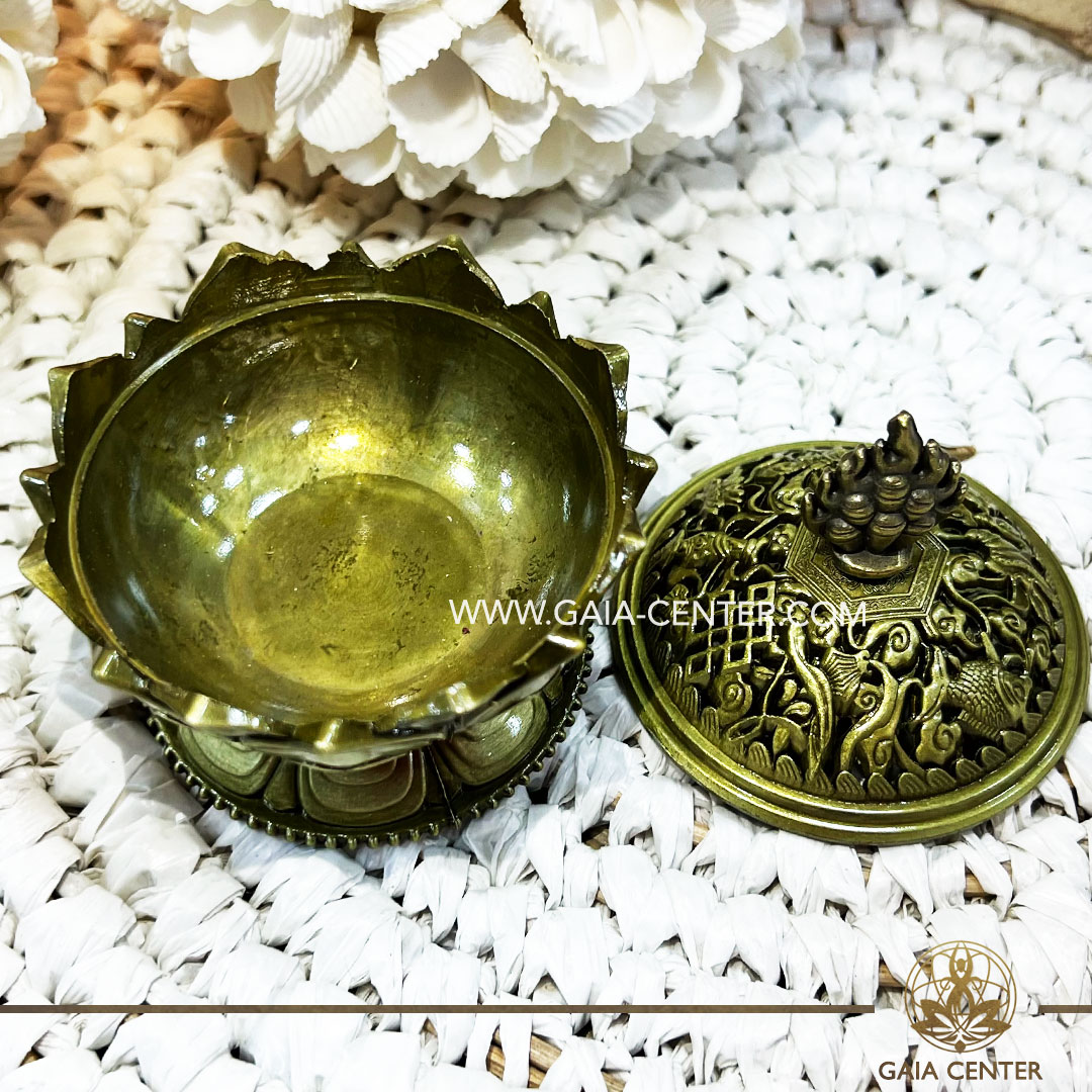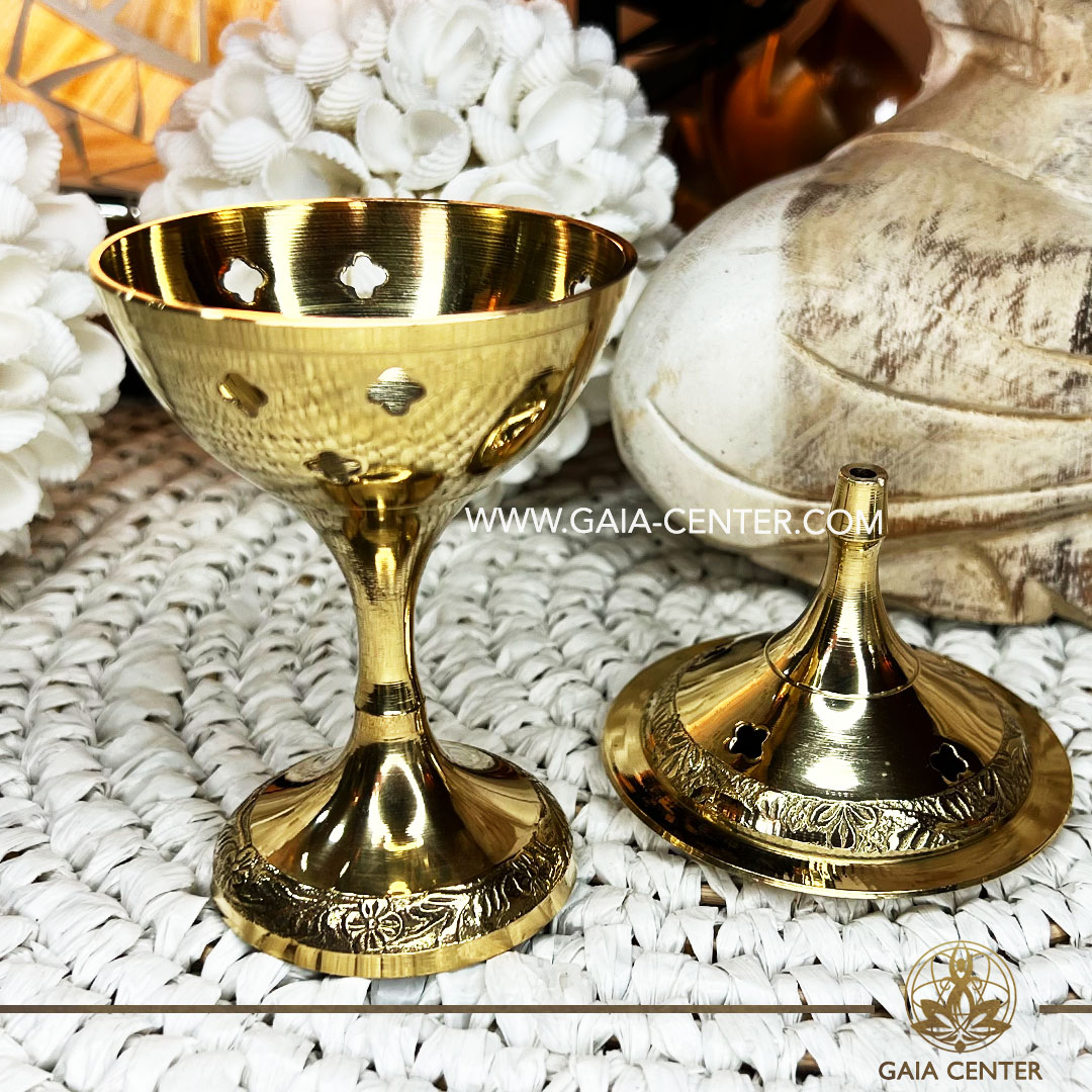 Brass incense burner is ideal for burning loose incense or resins. Selection of incense burners, aroma resins and smudge sticks for ceremonies and rituals at GAIA CENTER Crystals Incense shop in Cyprus.