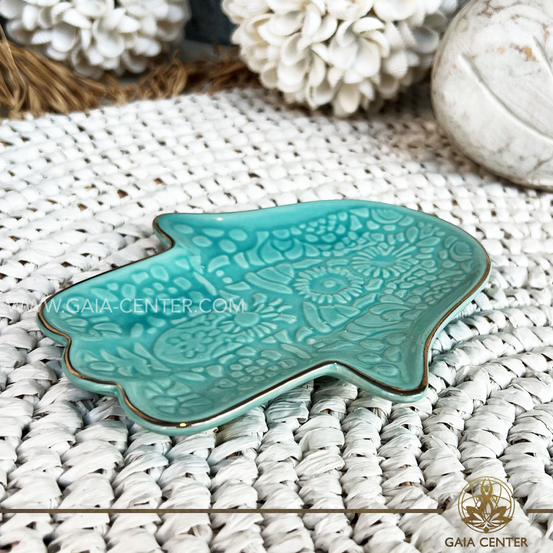 Ceramic Plate – Hamsa Hand Turquoise color Smudging plate for Palo Santo and White Sage at Gaia Center in Cyprus.