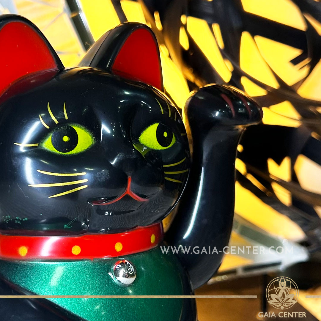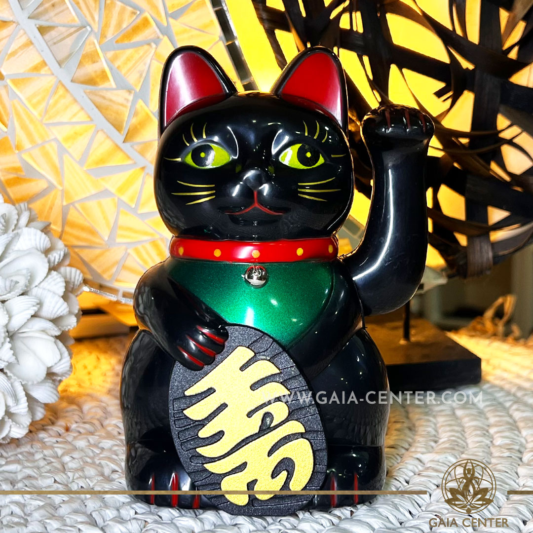 Lucky Money Black Shiny Cat – 6 inch with moving beckoning paw. Japanese Lucky Cat Maneki-Neko at Gaia Center Crystal Shop in Cyprus. Shop online, islandwide delivery: Limassol, Nicosia, Larnaca, Paphos.