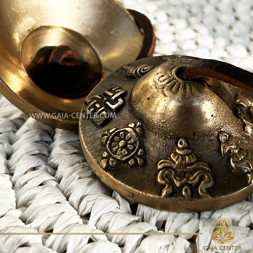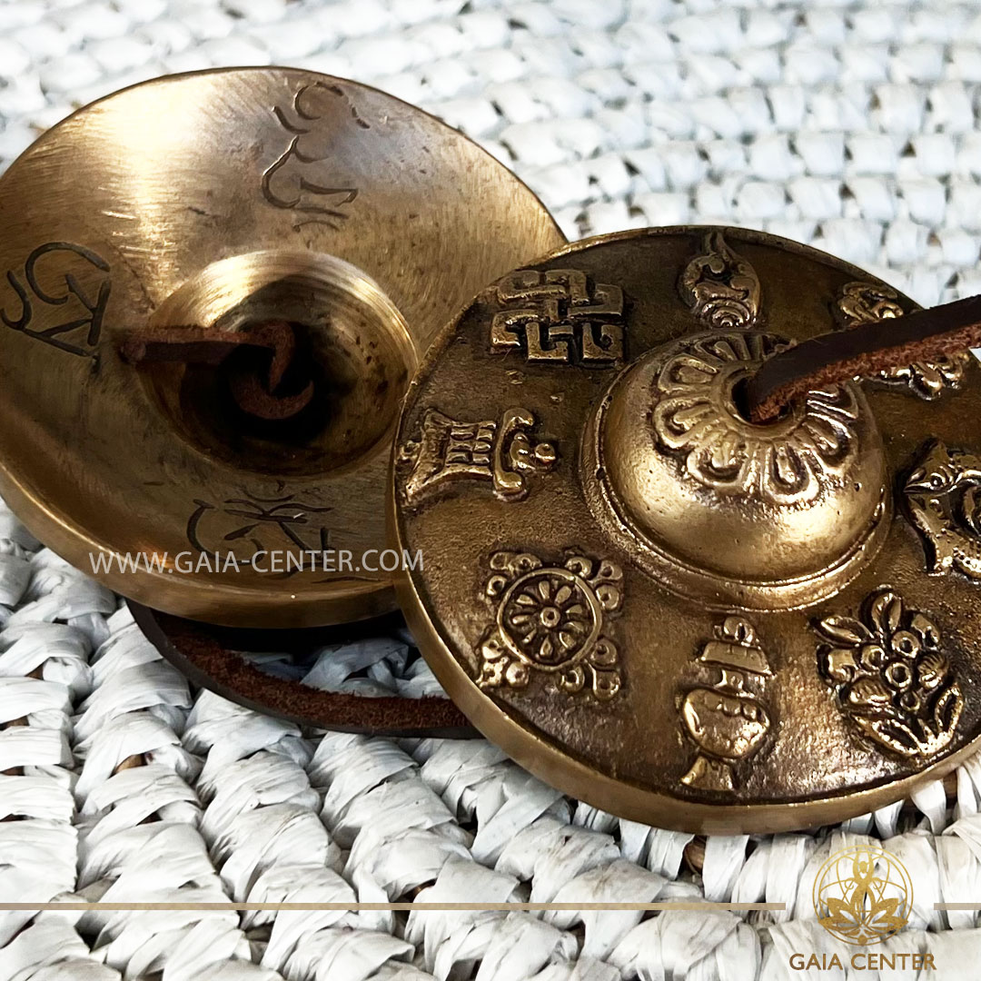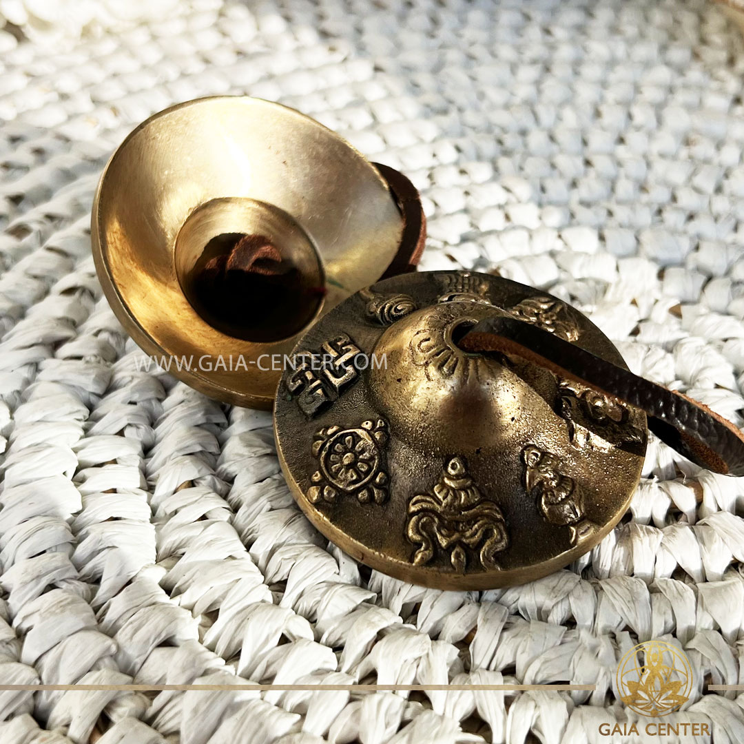 Tingsha Cymbals 8 Symbols of Prosperity | Brass 5.5cm| at GAIA CENTER | Crystal shop in Cyprus. Tingshas | Meditation Cymbals. The harmonious sound produced by Tingshas is considered sacred, believed to clear negative energies, invoke positive spirits, and create a sense of harmony within oneself and the surrounding environment. This makes them an integral part of Tibetan Buddhist rituals and ceremonies. Order tibetan singing bowls and tingshas online, Cyprus islandwide delivery: Limassol, Larnaca, Paphos, Nicosia. Europe and Worldwide shipping.