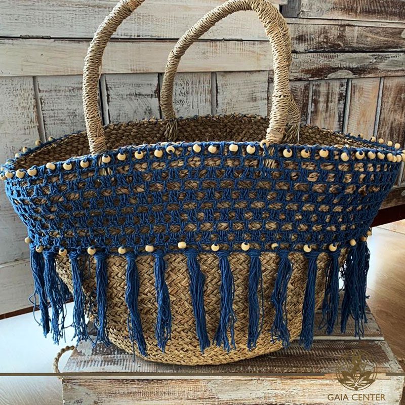 Natural color straw bag blue crochet and strings design.