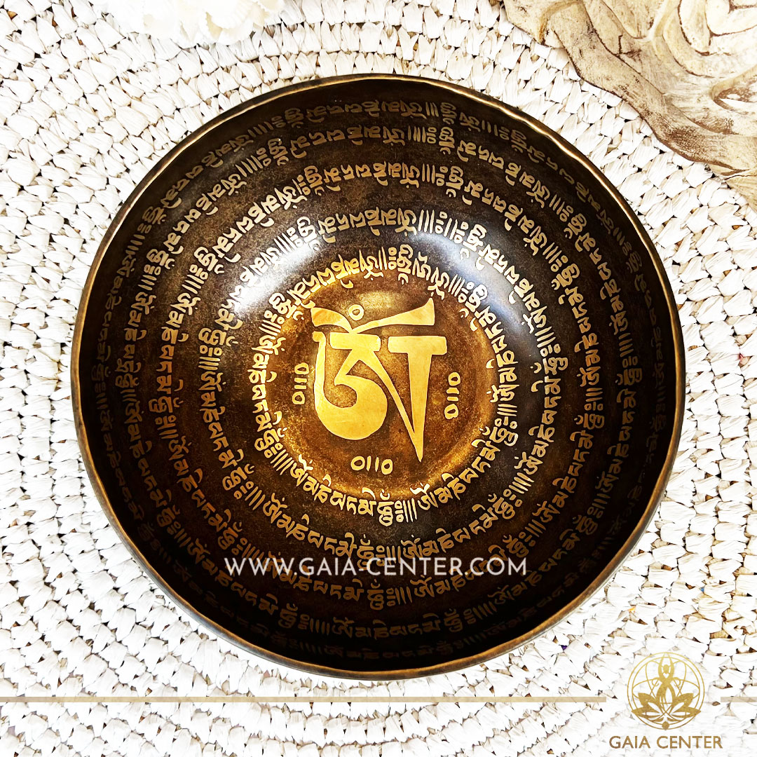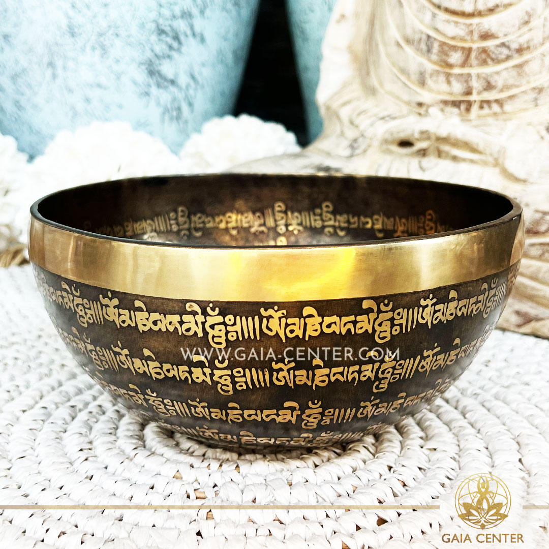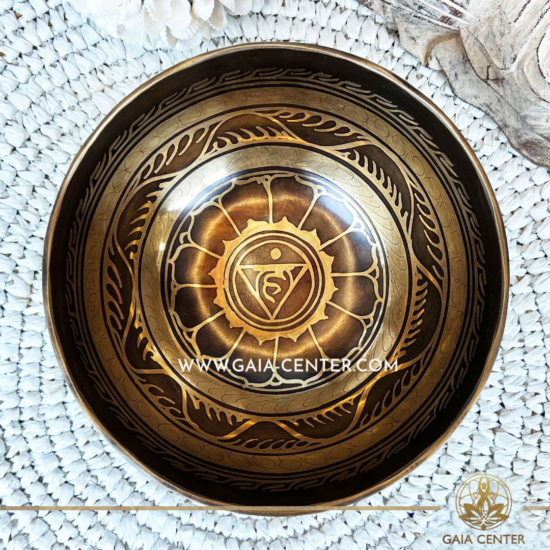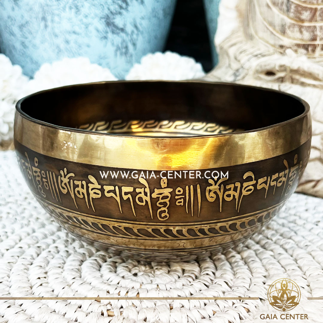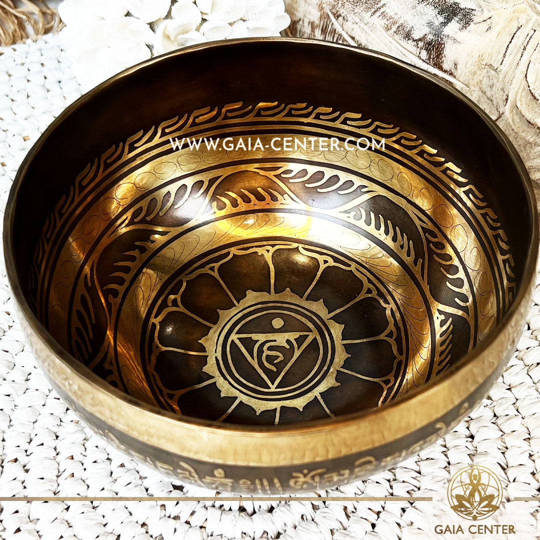 Tibetan Sining Bowl metal with engraved design auspicious buddhist symbols, Om symbol and prayers /mantras for Sound Healing Therapy at GAIA CENTER Crystals and Incense Shop in CYPRUS. Original top quality from Nepal. Cyprus delivery: Limassol, Paphos, Nicosia, Larnaca, Paralimni, Strovolos. Including provinces and small suburbs. Europe and International Worldwide shipping. Wholesale and Retail. Shop online for Singing Bowls: https://gaia-center.com