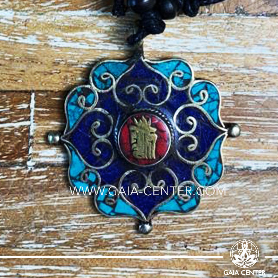 Tibetan Pendant style. Metal inlaid with semiprecious gemstones. Adjustable black string. Selection of Tibetan Jewelry made from crystals, gemstones, combination of metals at Gaia Center | Cyprus.