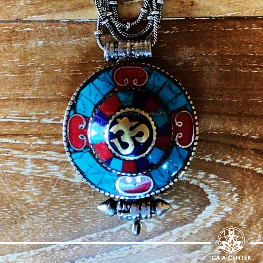 Tibetan gau pendant amulet box selection with semiprecious stones. Tibetan Pendant inlaid with turquoise, coral and lapis lazuli. Om symbol. Long chain. Selection of Tibetan Jewelry made from crystals, gemstones at Gaia Center | Cyprus.