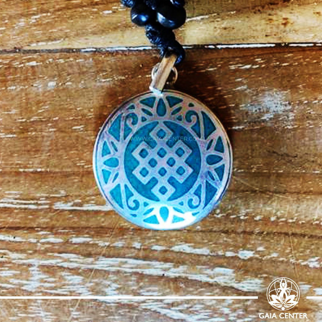 Tibetan Pendant Endless knot buddhist symbol inlaid with crystal stone – crushed turquoise. Adjustable black string.
