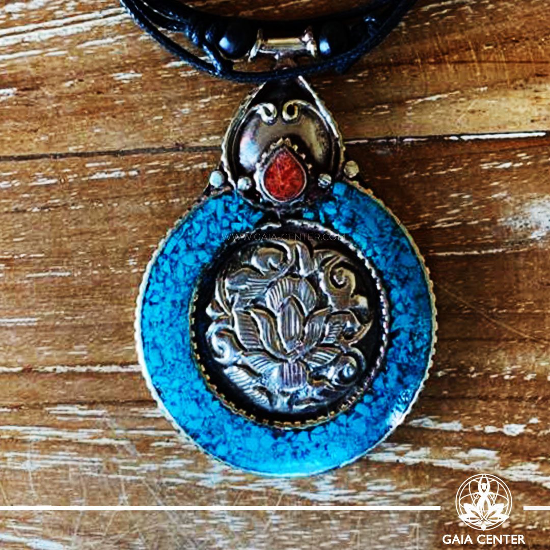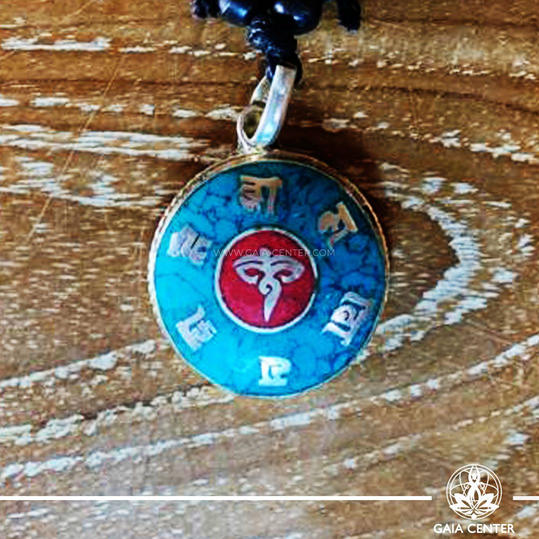 Tibetan Pendant turquoise and red color. Made from metal with engraved buddhist design, buddha eyes on an adjustable black string. Tibet Selection of Tibetan Jewelry made from crystals, gemstones, combination of metals at Gaia Center | Cyprus.