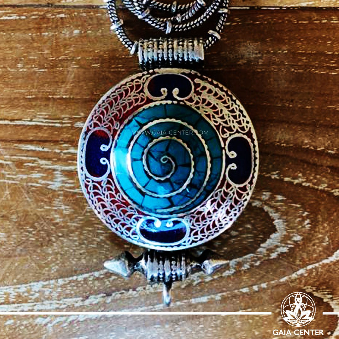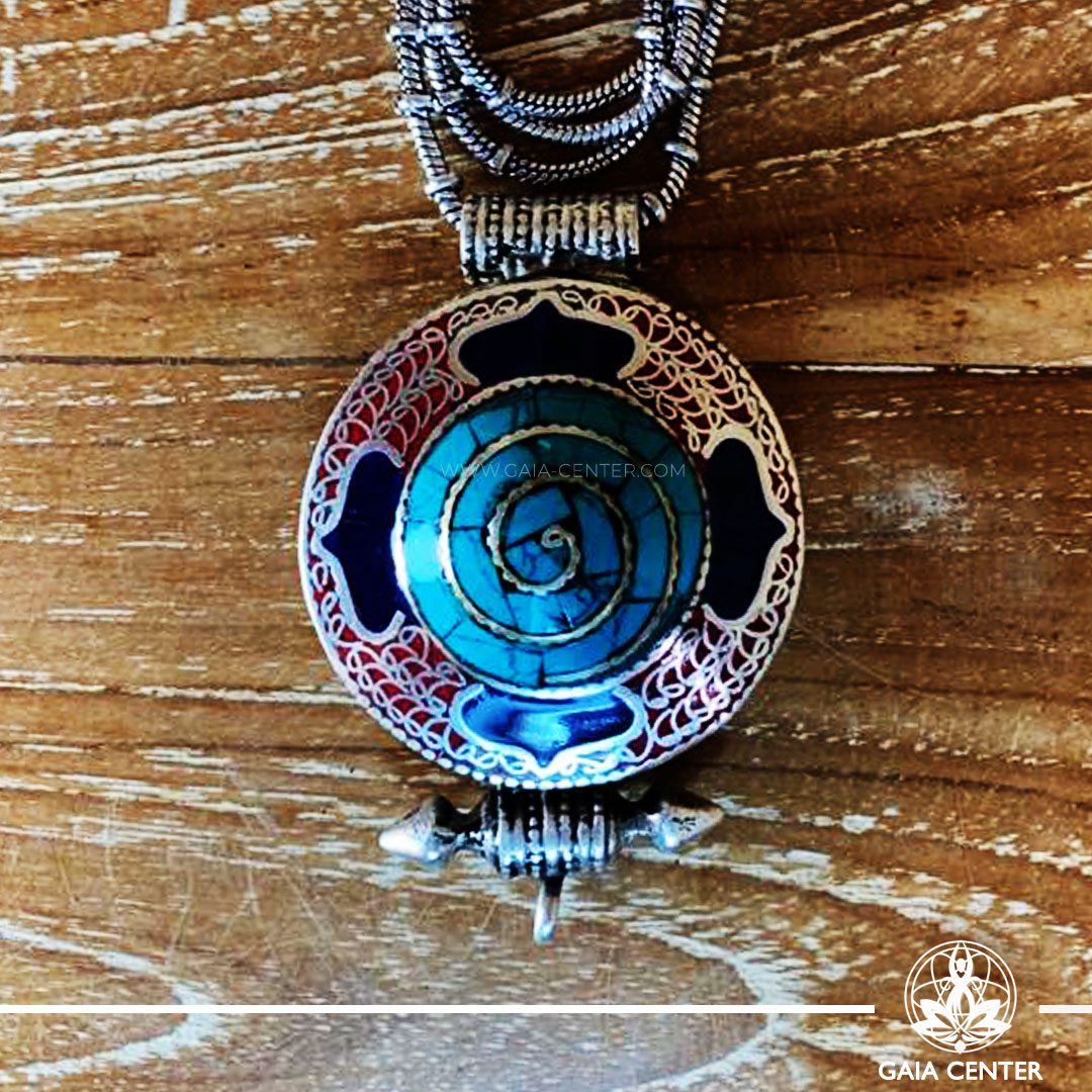 Tibetan gau pendant amulet box selection with semiprecious stones. Tibetan Pendant inlaid with turquoise, coral and lapis lazuli. Long chain. Selection of Tibetan Jewelry made from crystals, gemstones at Gaia Center | Cyprus.