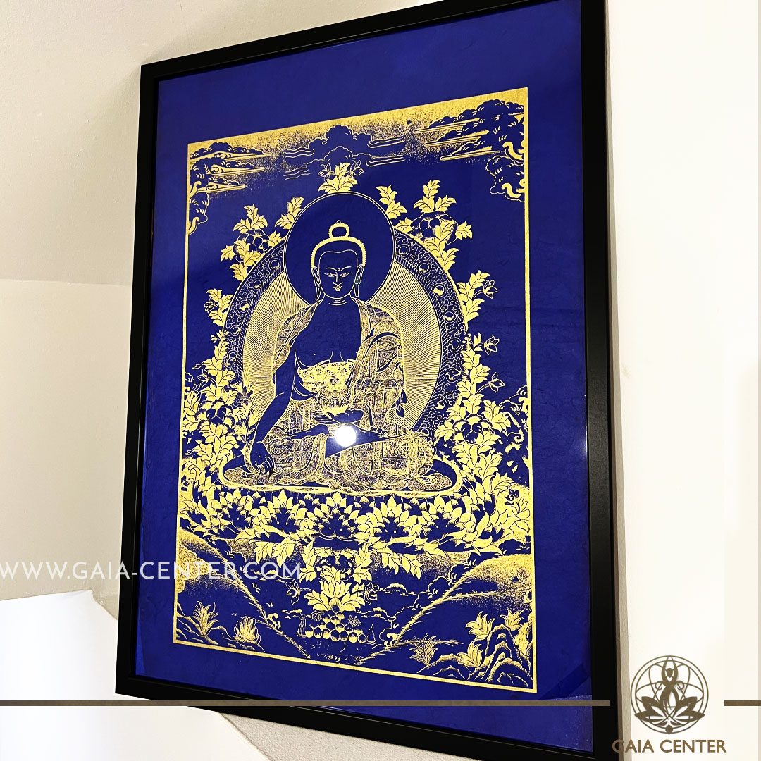 Tibetan Mandala Medicine Buddha Black & Gold Style in the frame.