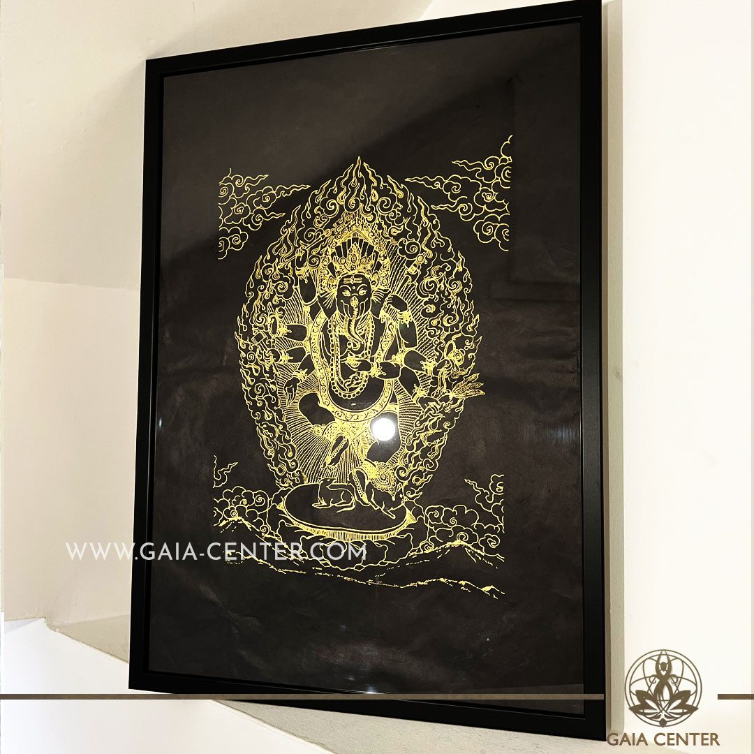 Tibetan Mandala Ganesha gold and black color in the frame.