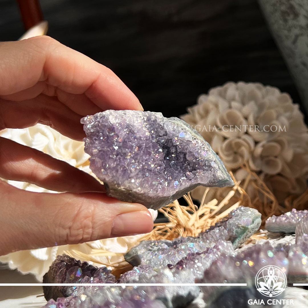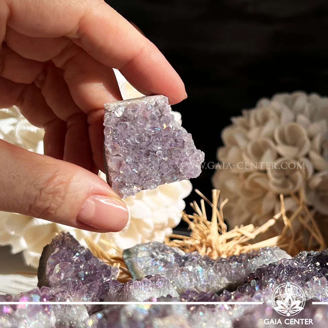 Each piece of Amethyst Aura Druze is naturally unique and carefully treated with pure metals like platinum and silver, creating its signature rainbow sheen. This process magnifies amethyst’s spiritual properties, blending earthly grounding with celestial light energy.